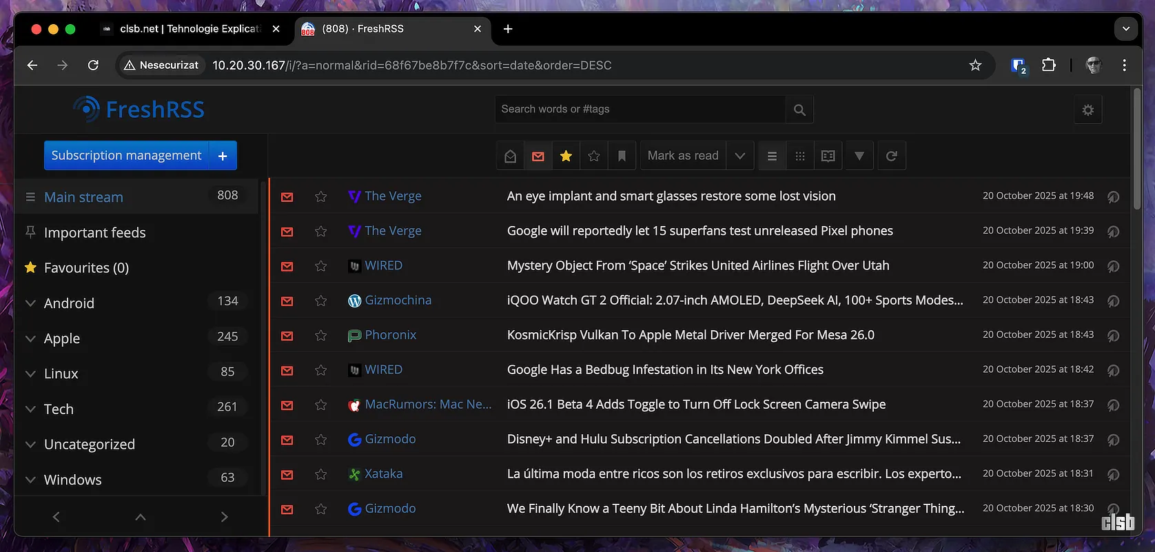 De câțiva ani, de când Feedly a devenit aproape inutilizabil pentru nevoile mele, am migrat către o soluție self-hosted care îmi oferă control total și o experiență de citire personalizată. Piesa centrală a acestui sistem este FreshRSS, un agregator de știri open-source pe care l-am instalat într-un container LXC pe home server-ul personal, configurat ca atare cu Proxmox într-un mini PC.