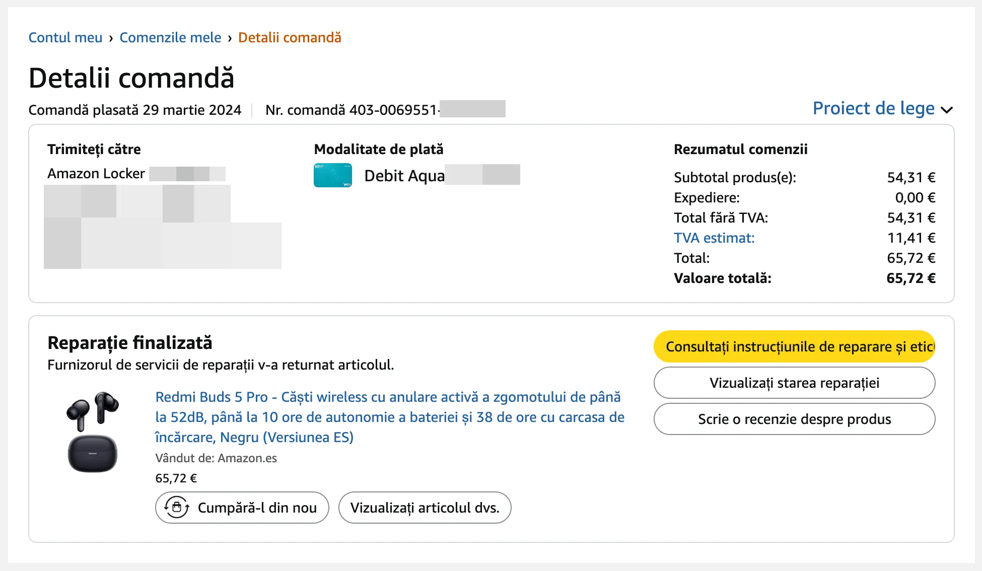 Căutând detaliile despre comandă și procedura de retur, mi-am dat seama de o mică eroare pe care am făcut-o în articolul precedent. Acolo vă spuneam că le-am achiziționat în martie 2025, dar realitatea este că le cumpărasem, de fapt, în martie 2024. Așadar, micile Redmi Buds au reușit, totuși, să „supraviețuiască” aproape doi ani de utilizare zilnică înainte ca bateria să devină inutilizabilă.