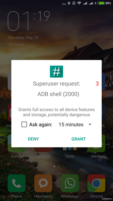 Activați depanarea USB și urmăriți cu atenție ecranul dispozitivului. Atunci când SuperSU va întreba dacă doriți să acordați permisiuni root pentru ADB și AndroidRpcSerivice, apăsați Grant înainte de epuizarea timpului oferit pentru răspuns.