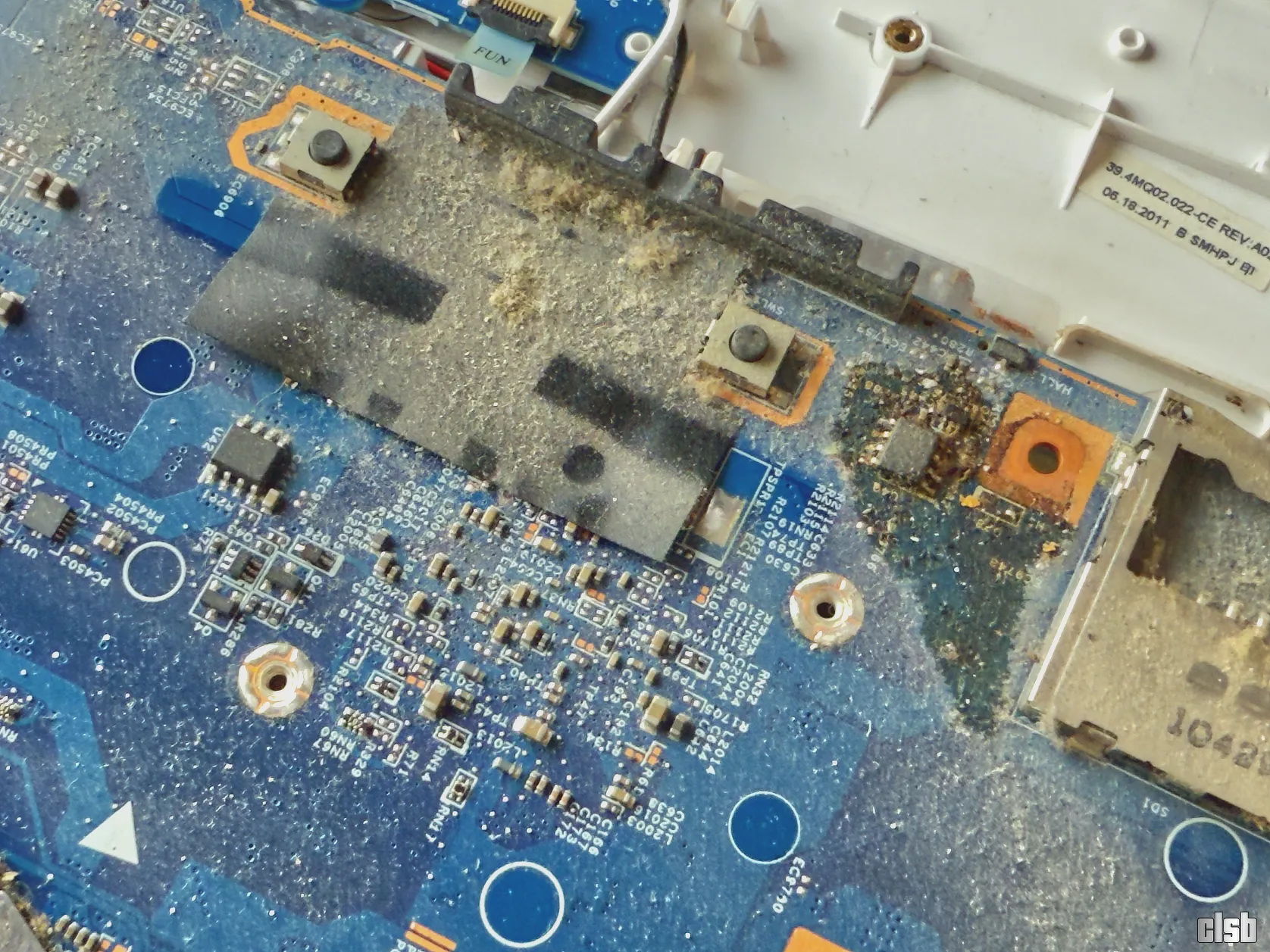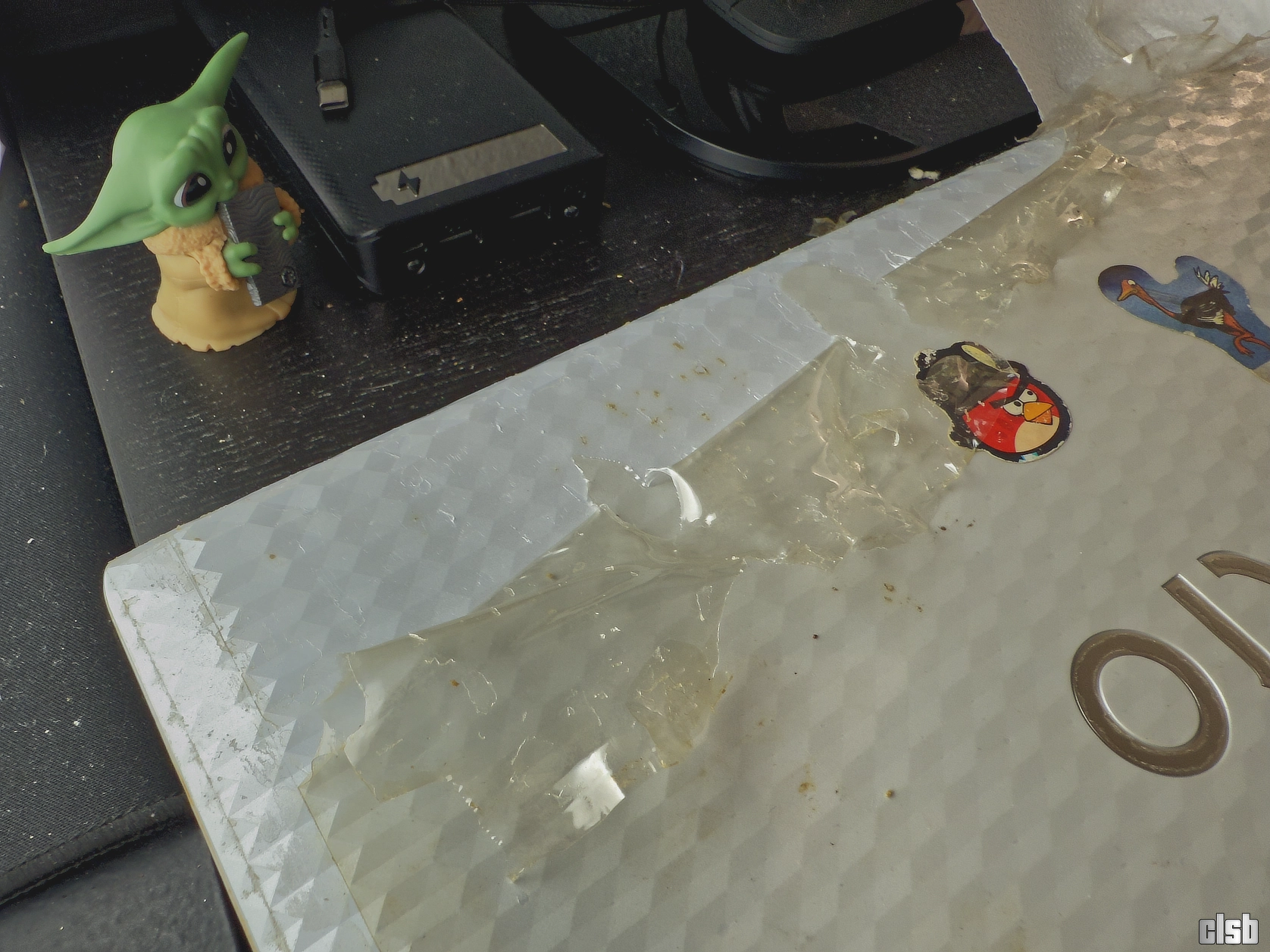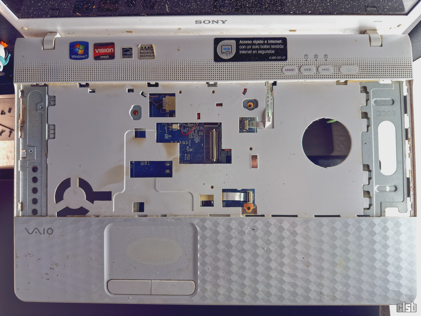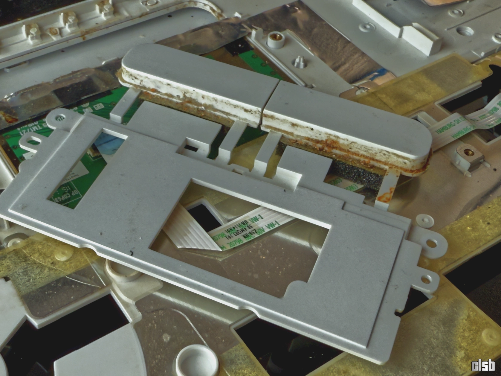 Starea interioară era pur și simplu deplorabilă, un amestec de praf compactat și urme de lichide uitate de ani de zile pe componente. Pe lângă mizeria clasică, am avut de furcă și cu o folie protectoare mătuită care se dezlipea în bucăți, lăsând în urmă un strat de adeziv extrem de încăpățânat. A fost nevoie de multă răbdare și substanțe dedicate pentru a curăța totul fără a deteriora plasticul sau circuitele.