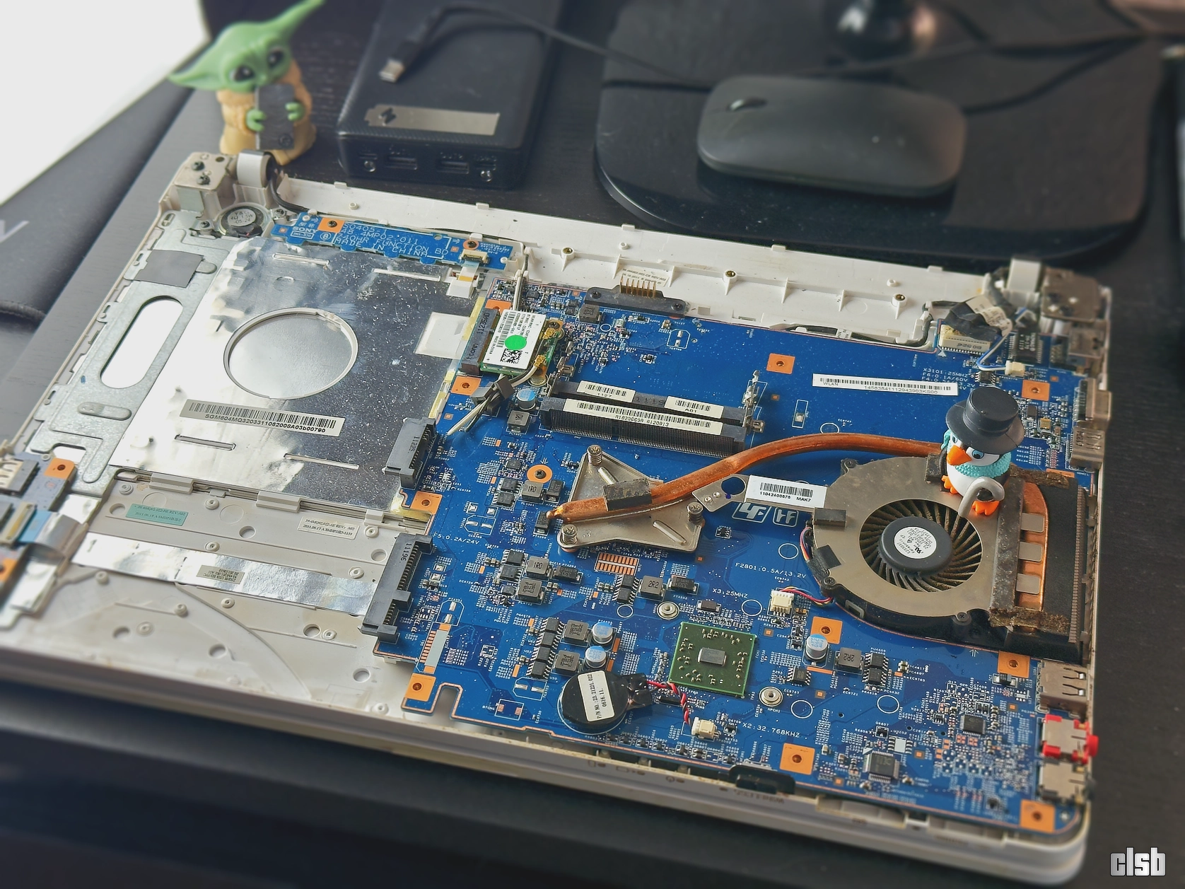 La final, cu Linux Mint instalat pe noul SSD, bătrânul Vaio se mișcă surprinzător de bine pentru vârsta lui venerabilă, atât doar că a trebuit bibilit pentru a face trackpad-ul funcțional și înlocuit adaptorul Wi-Fi pentru compatibilitate (venea cu unul de la Atheros, imposibil de folosit în Linux. Chiar dacă investiția nu a fost neapărat logică din punct de vedere strict economic, satisfacția de a vedea un echipament salvat de la groapa de gunoi rămâne neprețuită. Sper ca aceste imagini să vă servească drept memento: nu așteptați 15 ani înainte de a deschide capota computerului personal pentru o igienizare necesară.