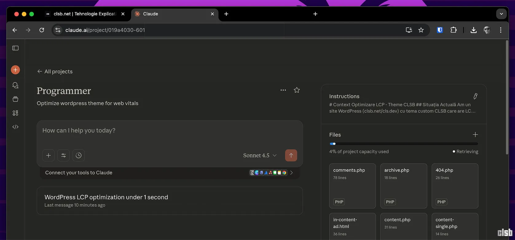Weekend. Sunt de gardă, deci trebuie să stau aproape de pc și telefon. Cumva, îmi prinde bine „arestul la domiciliu”, pentru că am o problemă ce mă scoate din minți: scorul prost la LCP al blogului, care mă bântuie de aproape o lună. Am depistat-o prin octombrie, dar n-am reușit să-i găsesc cauza nici cu ajutorul AI-ului. De altfel, a fost unul dintre motivele pentru care am renunțat la Gemini, dezamăgit de cât de prost se descurca la programare, așa că era un moment bun să-mi fac abonament la Claude Pro și să-i dau de lucru. Zis și făcut.