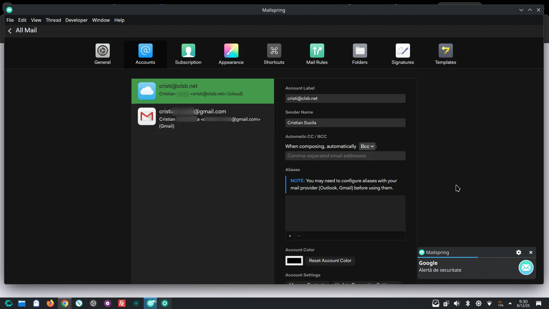 Diferența față de experiența cu KMail a fost ca de la cer la pământ. Dacă în KMail nu am fost capabil să conectez contul de iCloud – pe care îl folosesc pentru cumpărături, blog și alte servicii mai puțin „delicate” – pe Mailspring totul a durat mai puțin de trei minute.