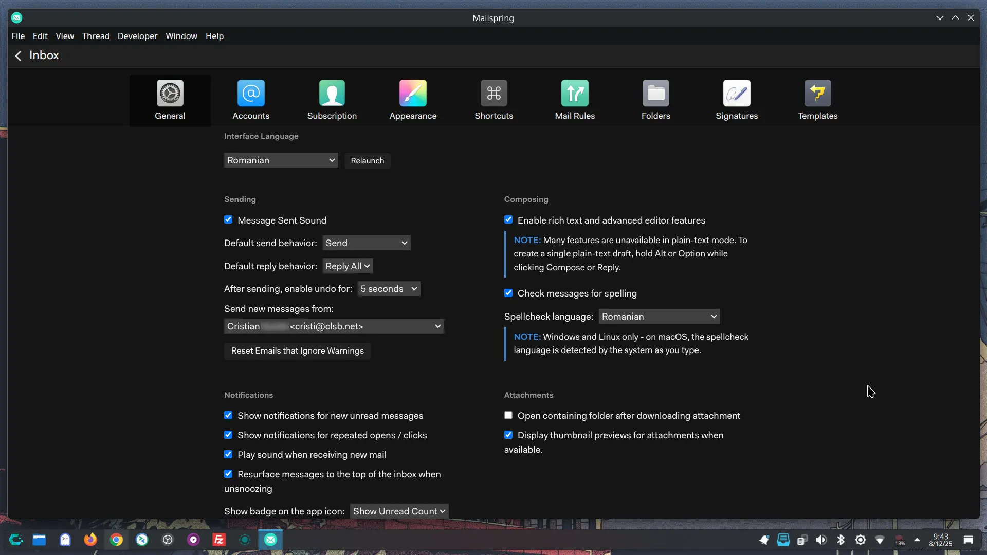 Analizând puțin mai atent meniurile, am redescoperit de ce Mailspring este atât de apreciat pentru productivitate. Nu e doar un „cititor” de mailuri, ci vine cu un set de unelte de „fine tuning” care îți fac viața mai ușoară, mai ales dacă vii din alte ecosisteme.
