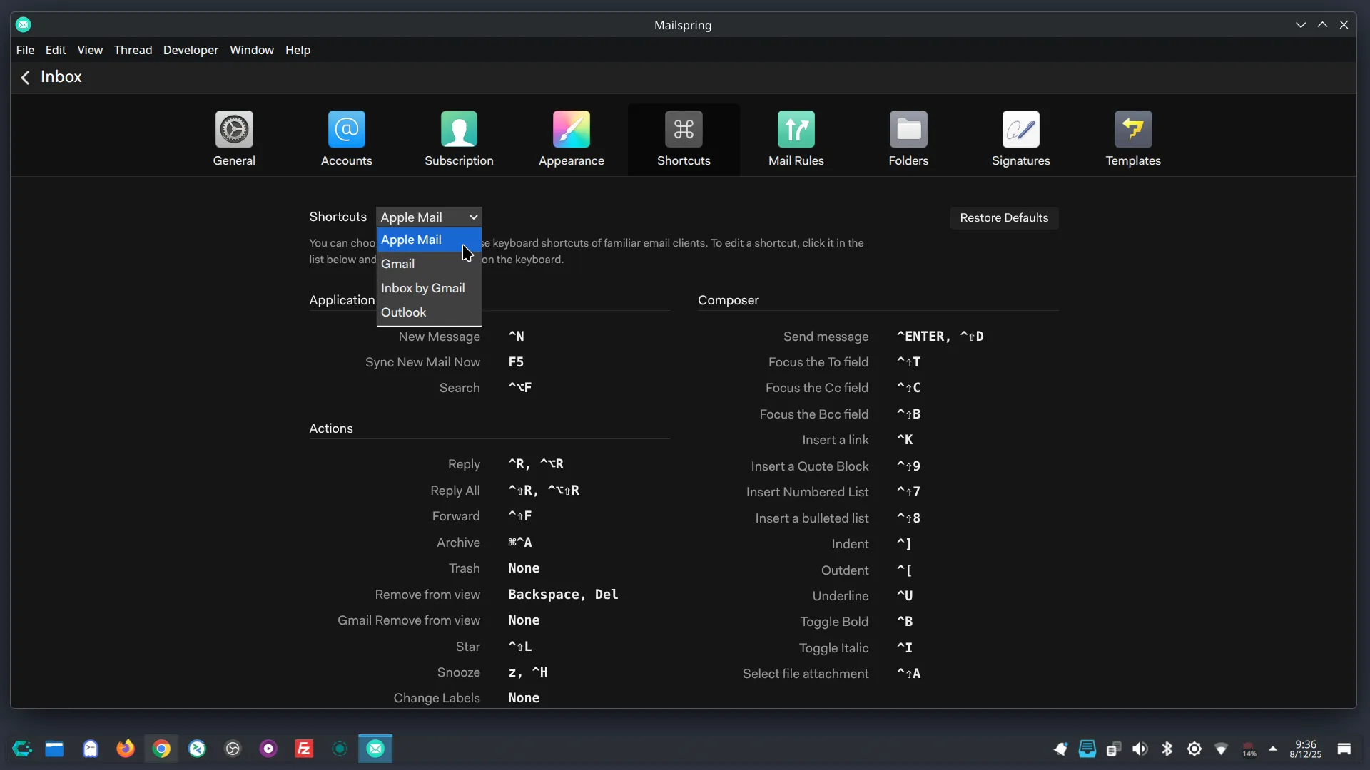 Trecerea de la un sistem de operare la altul poate fi brutală pentru memoria musculară. Mailspring rezolvă elegant acest aspect permițându-ți să alegi setul de scurtături de la tastatură.