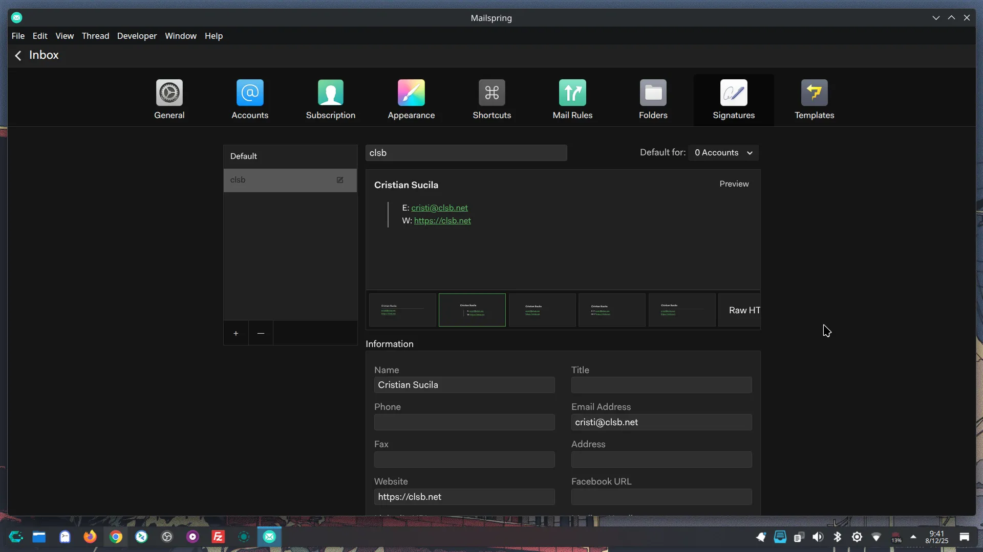 Pentru contul de pe domeniul clsb.net, am putut configura rapid o semnătură profesională, cu linkuri active către site și adresă, totul arătând impecabil în previzualizare.