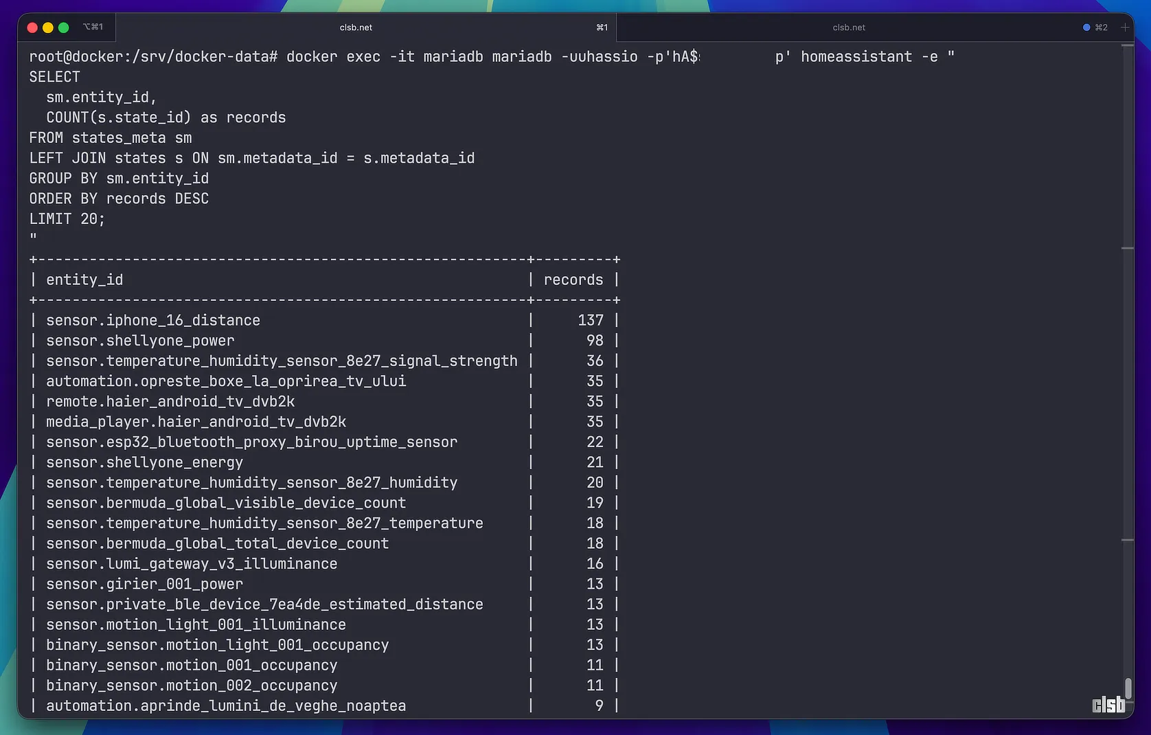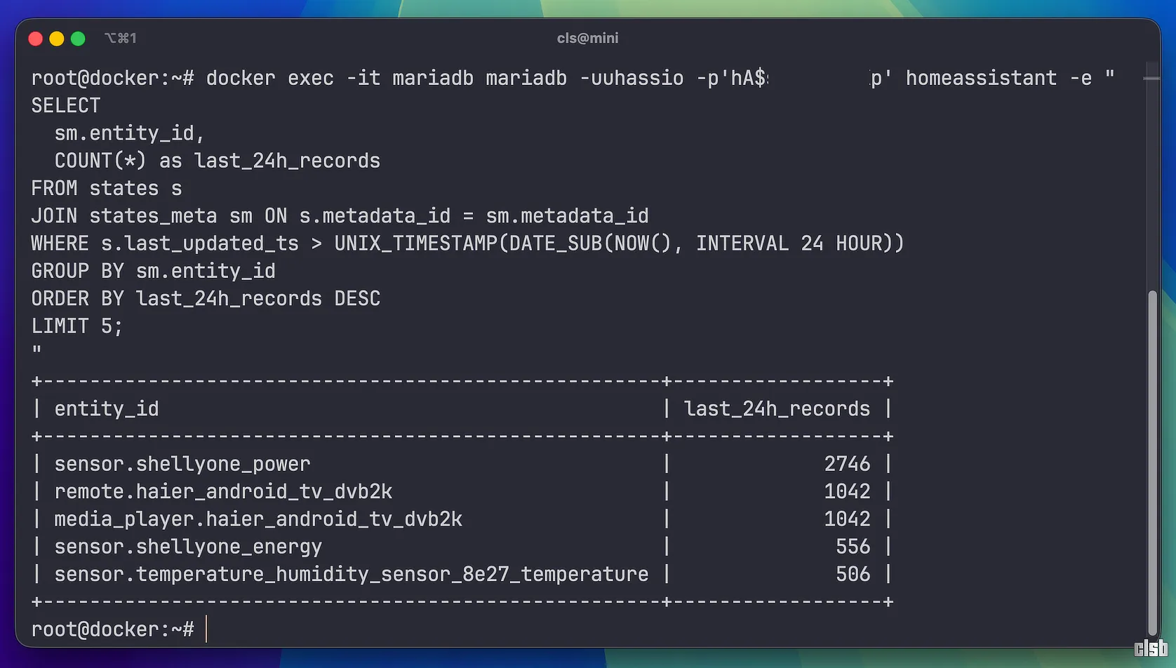 docker exec -it mariadb mariadb -uuhassio -p'phassio' homeassistant -e "SELECT sm.entity_id, COUNT(*) as last_24h_records FROM states s JOIN states_meta sm ON s.metadata_id = sm.metadata_id WHERE s.last_updated_ts > UNIX_TIMESTAMP(DATE_SUB(NOW(), INTERVAL 24 HOUR)) GROUP BY sm.entity_id ORDER BY last_24h_records DESC LIMIT 5;"