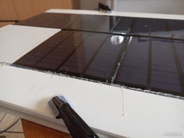 Planul era să așez câte trei celule fotovoltaice pe două rânduri, pentru a forma un panou de 12V și aproximativ 18W, dar cum m-am zgârcit și n-am cumpărat celule de rezervă, a trebuit să mă mulțumesc deocamdată cu doar 5, al șaselea înlocuindu-l temporar cu placaj.