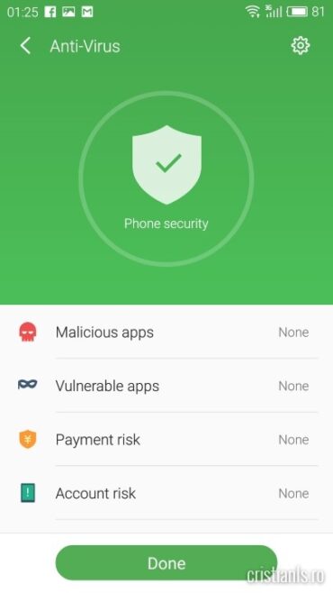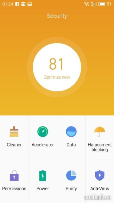 Dacă în cazul altor telefoane trebuie să apelezi la tot felul de tertipuri pentru a obține acces root, în Flyme OS 5 se rezolvă prin simpla bifare a unei casete. În plus, dispui și de un centru de securitate implementat sub forma unei aplicații convenționale, cu care poți gestiona lista de apelanți, permisiunile aplicațiilor, elimina temporarele, efectua o scanare antivirus, șamd.