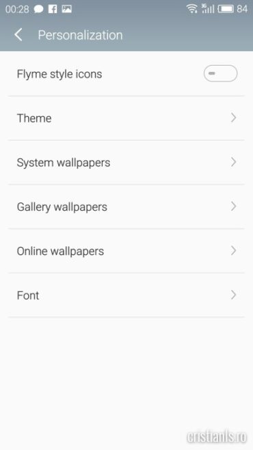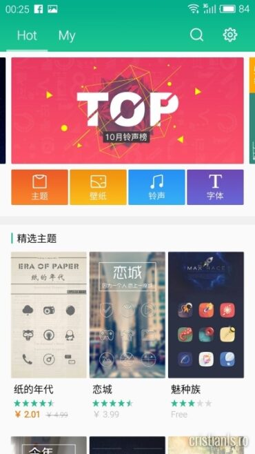Cei nu foarte încântați de ceea ce văd, pot opta pentru instalarea unei teme. În acest sens, Flyme OS 5 vine însoțit de aplicația Themes, un fel de magazin cu teme, imagini de fundat și tonuri de apel, ce pot fi descărcate gratuit sau contra cost, dar care, din păcate, momentan nu este tradus nici măcar în engleză și se încarcă, cel puțin din România, destul de greoi.