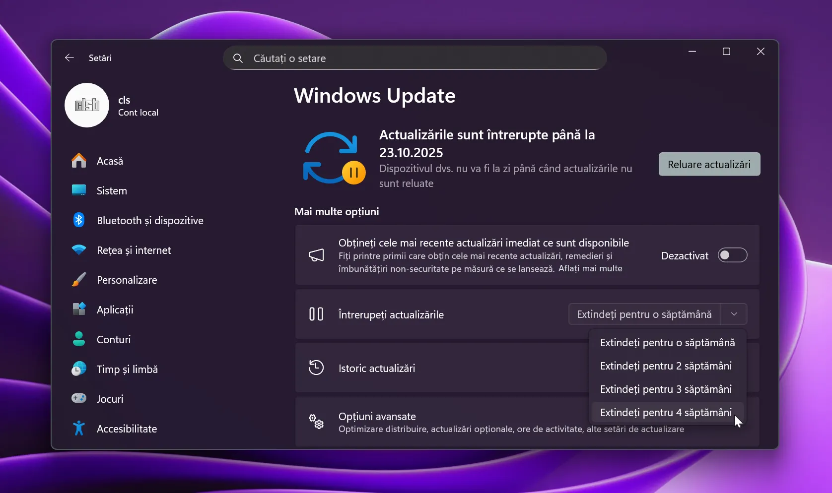 Navighează din nou în Setări > Windows Update. În secțiunea Întrerupeți actualizările (Pause updates), vei găsi un meniu derulant care îți permite să selectezi o perioadă de pauză, de la o săptămână până la maximum patru.