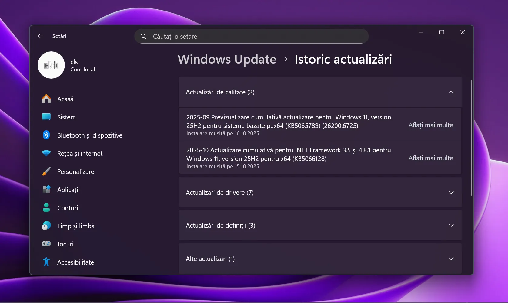 Aici sunt listate cronologic toate actualizările instalate pe sistem, fie că sunt de calitate, de definire pentru antivirus sau drivere.