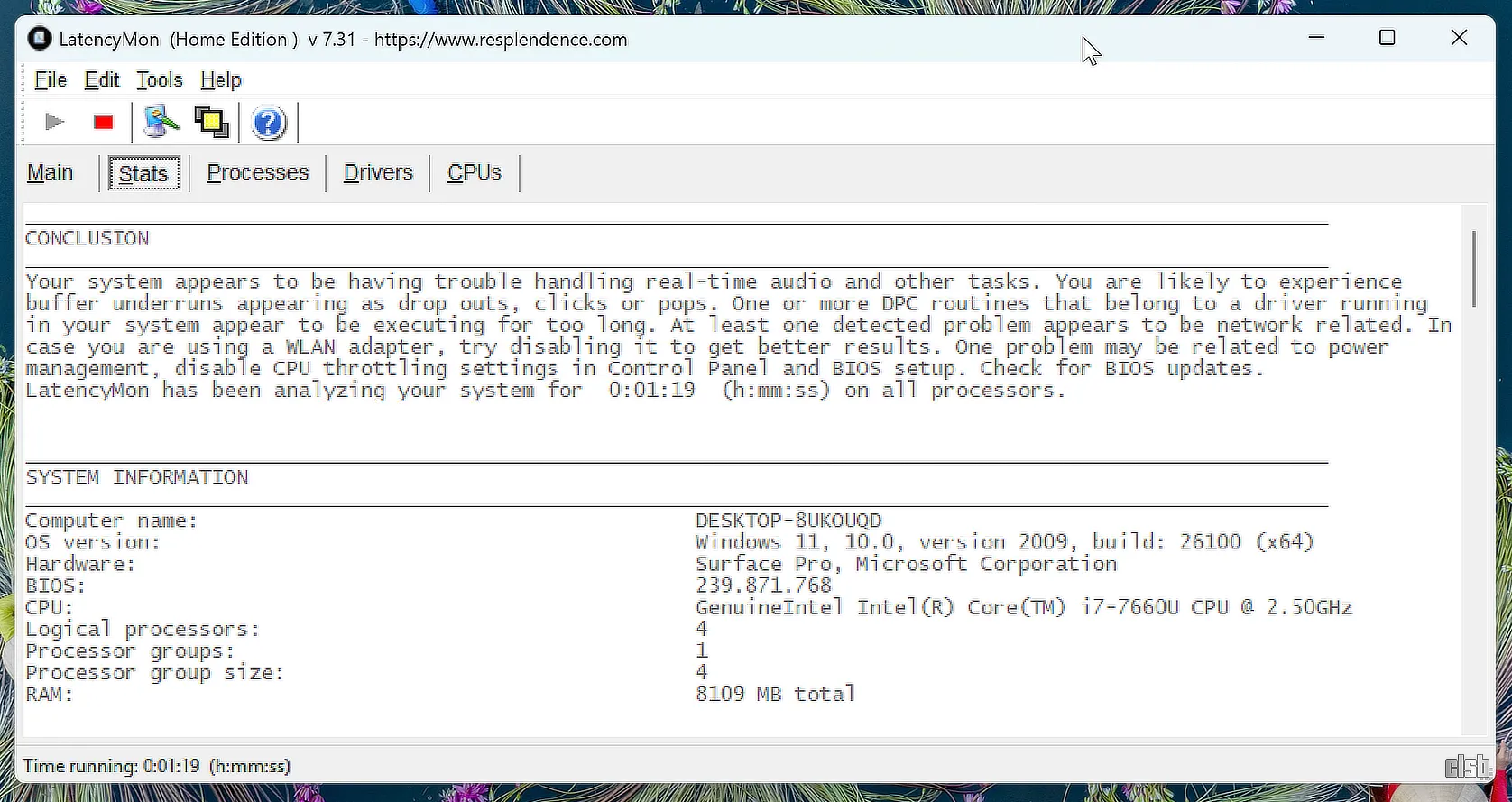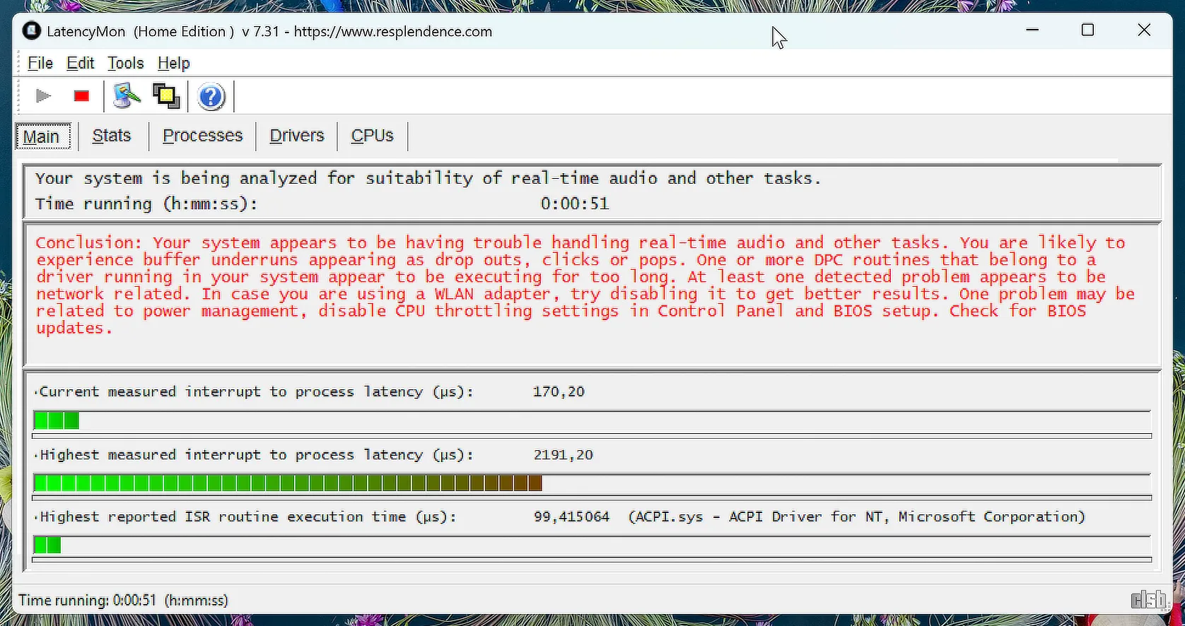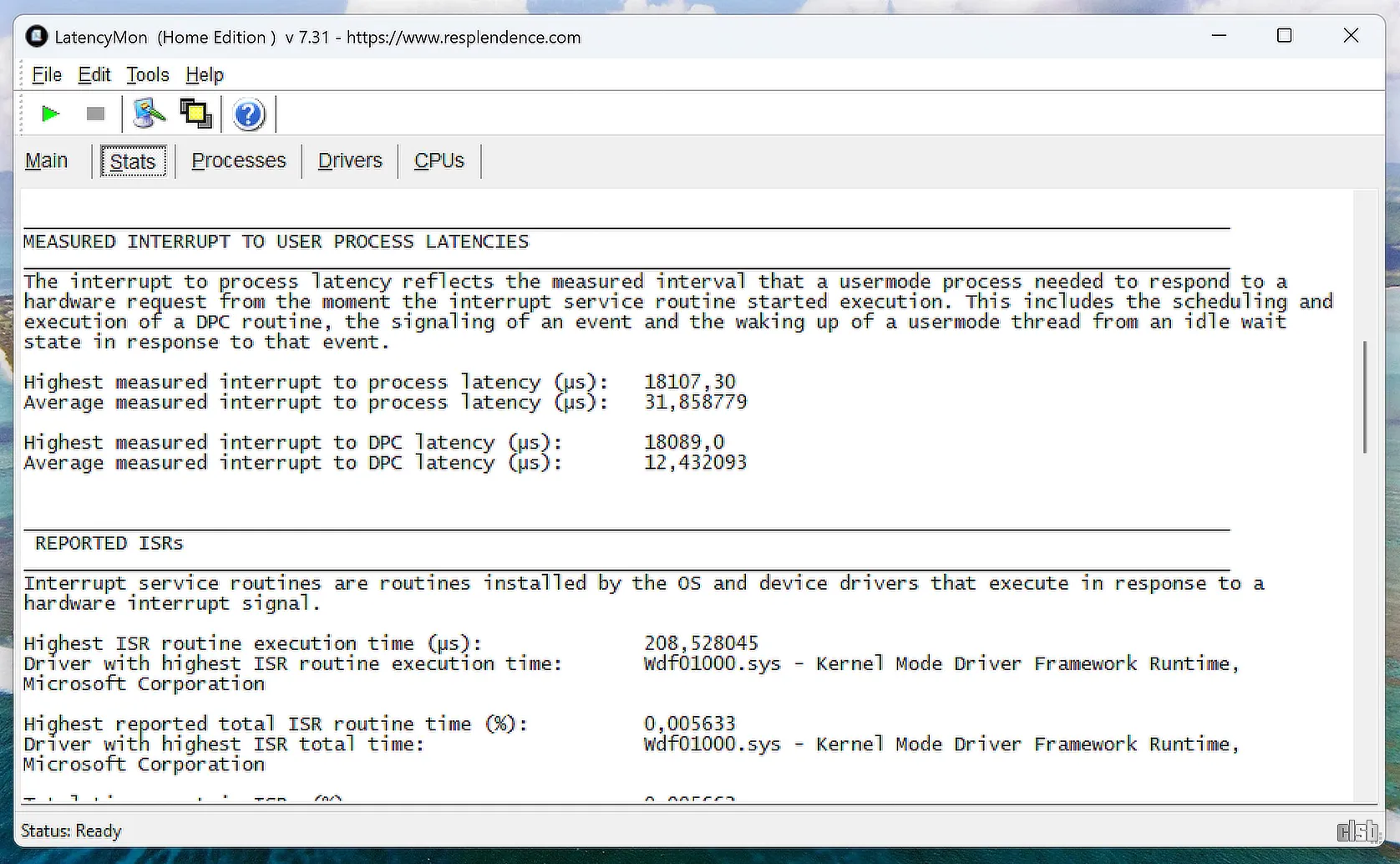 Dezvoltat de Resplendence Software, LatencyMon este proiectat pentru a măsura și analiza timpii de răspuns ai kernel-ului sistemului de operare. În termeni simpli, verifică dacă o componentă software (de obicei un driver) monopolizează procesorul pentru prea mult timp, împiedicând astfel alte sarcini, inclusiv cele audio, să-și primească datele la timp. Acest fenomen nu cauzează doar pocnituri în sunet, ci poate duce la o senzație generală de lentoare a sistemului.