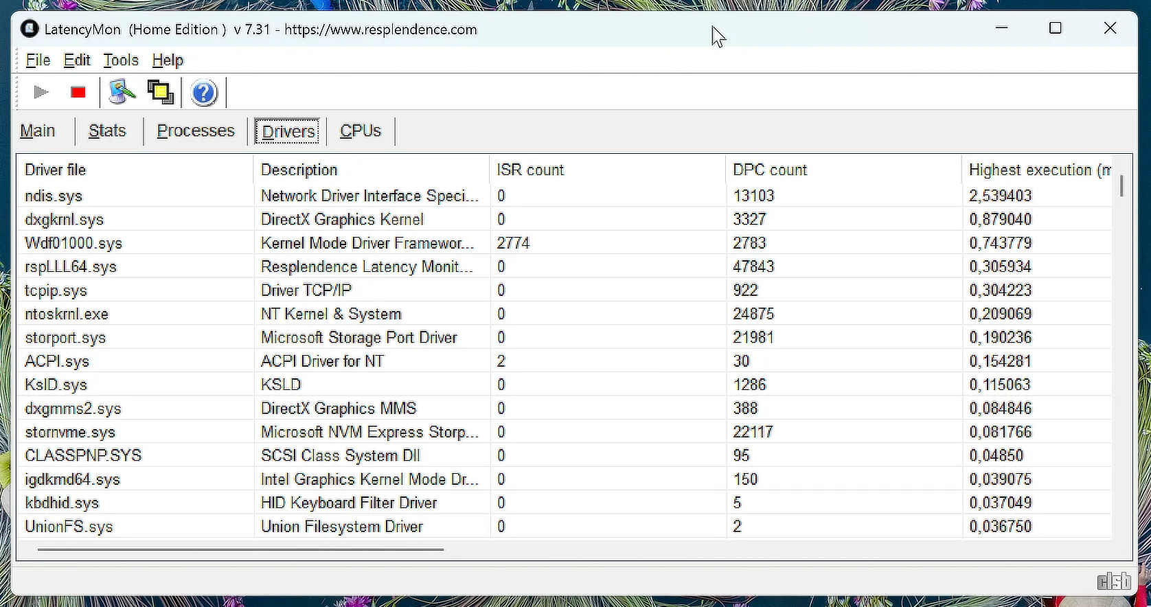 În tab-ul Drivers, LatencyMon listează toate fișierele de driveri activi și măsoară impactul fiecăruia. Sortând după coloana „Highest execution”, poți vedea rapid care sunt cei mai „vorbăreți” și care ar putea fi sursa întreruperilor. În analiza mea, driverul de rețea (ndis.sys) și cel al plăcii grafice (dxgkrnl.sys) erau în topul listei – o cauză clasică nu doar pentru probleme audio, ci și pentru sacadări în jocuri, în redarea video sau chiar în mișcarea ferestrelor pe ecran.