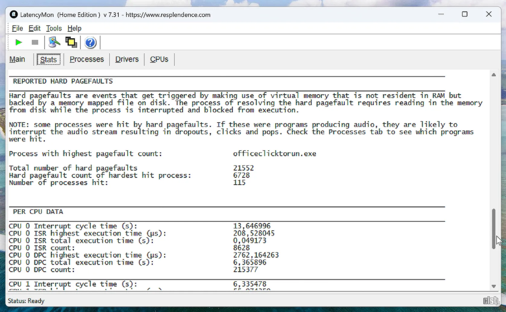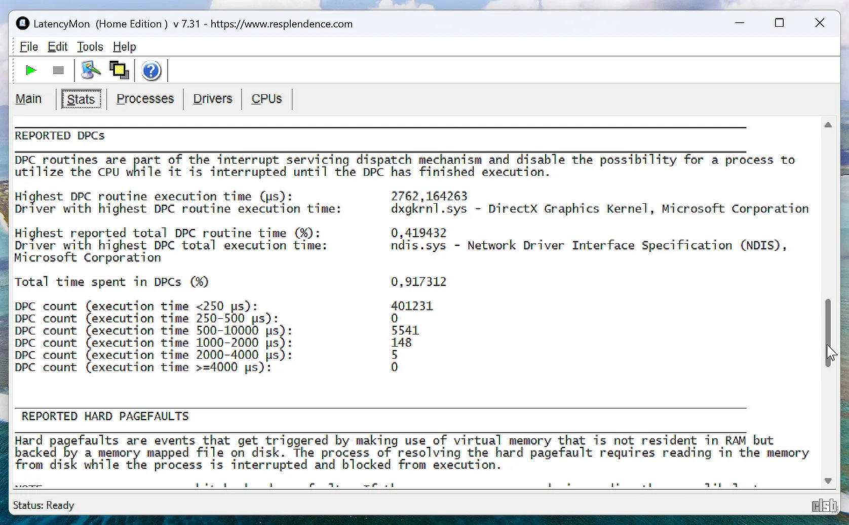 Pentru o analiză și mai detaliată, tab-ul Stats oferă informații despre DPC-uri (Deferred Procedure Calls), ISR-uri (Interrupt Service Routines) și „hard pagefaults”. Deși sună complicat, aplicația oferă explicații clare pentru fiecare categorie. Aceste date sunt utile utilizatorilor avansați pentru a înțelege exact mecanismul tehnic din spatele problemei.