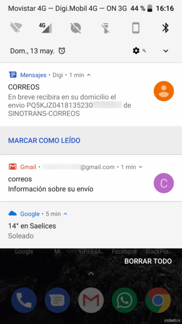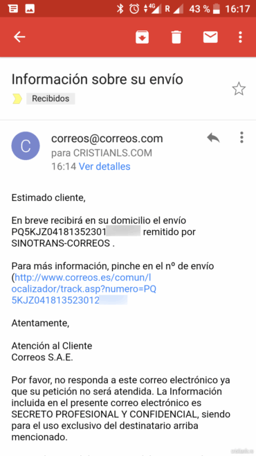 Voiam să vă vorbesc despre principala diferență dintre Poșta Română și Correos, poșta spaniolă. Ei bine, primirea coletelor în Spania, prin Correos, provenite din China înseamnă relax total! Cu una sau două zile înainte să-ți bată poștașul la ușă primești un SMS și-un email care te anunță că ți-a sosit coletul și-ți va fi livrat curând: