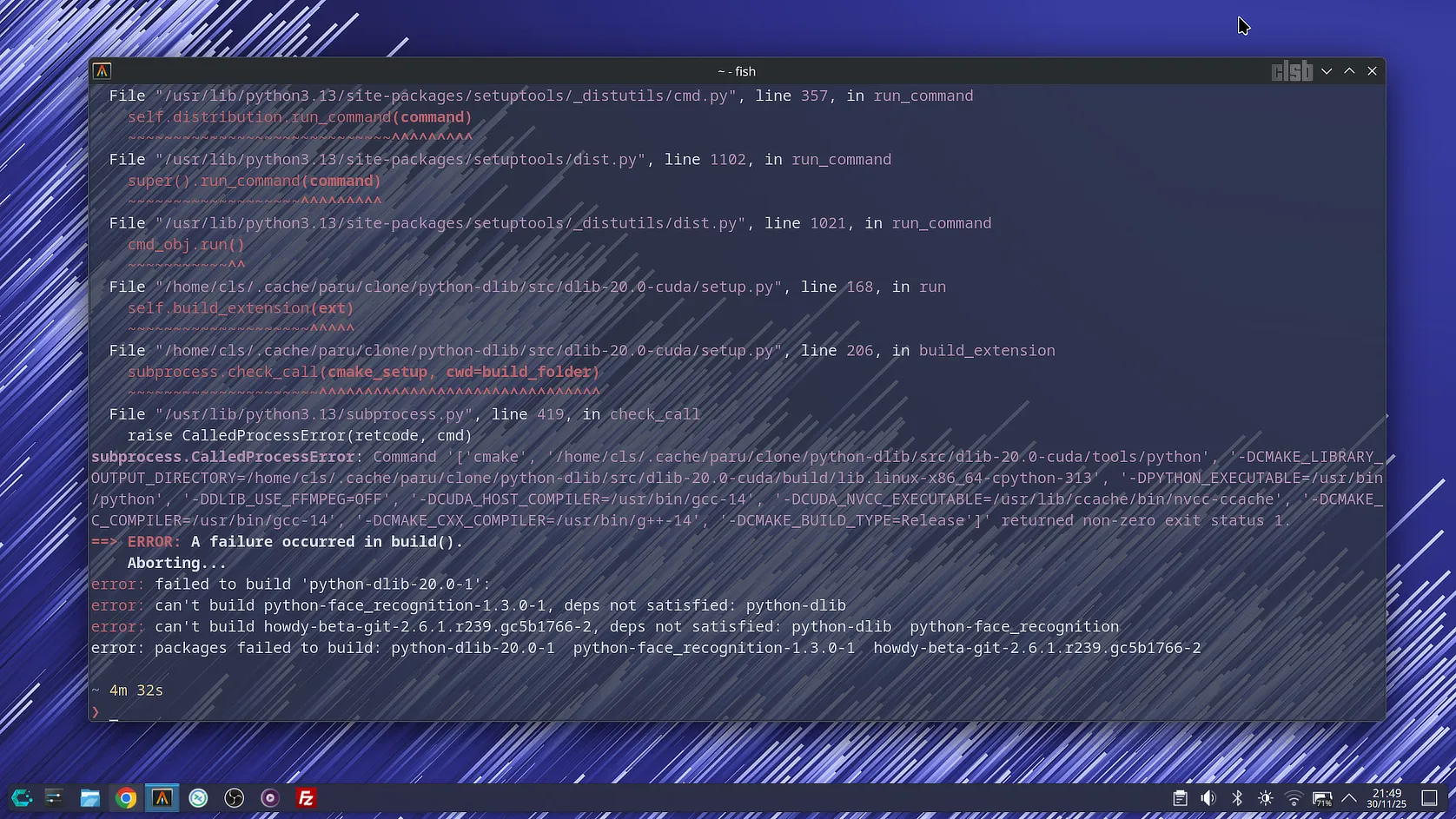 După ce am scăpat de eroarea PAM, m-am lovit de un alt zid: compilarea librăriei dlib, care este motorul de recunoaștere facială din spatele Howdy. Eroarea pe care o primeam era destul de criptică, referindu-se la lipsa unei căi (path) complete pentru compilator: