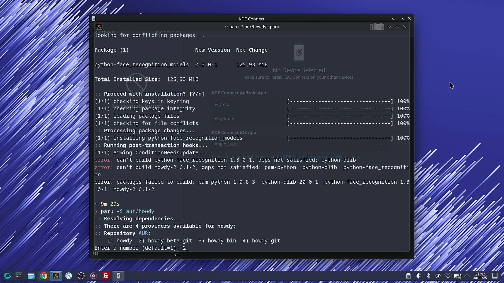 Prima încercare de instalare, folosind comanda clasică paru -S howdy, a eșuat lamentabil. Motivul principal a fost că pachetul standard depinde de pam-python, un modul abandonat de ceva vreme, care nu mai este compatibil cu structurile interne din Python 3.12.