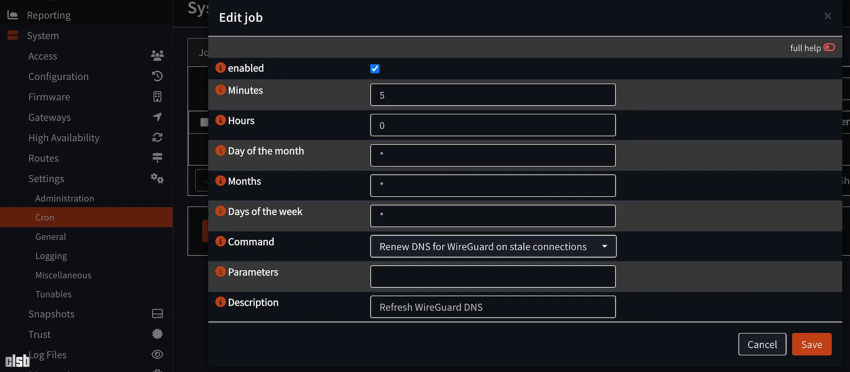- Cron Job pentru DNS: Conexiunile pe IP dinamic (DDNS) pot rămâne blocate dacă IP-ul serverului se schimbă. Mergeți la System » Settings » Cron și adăugați un job:
