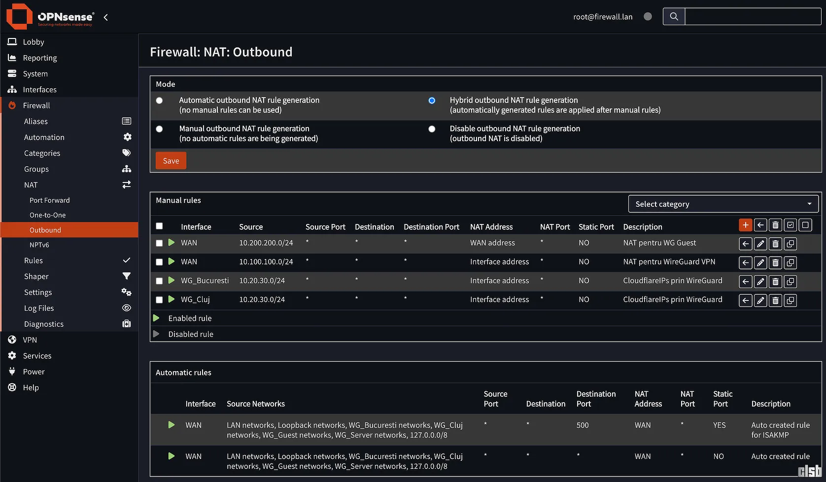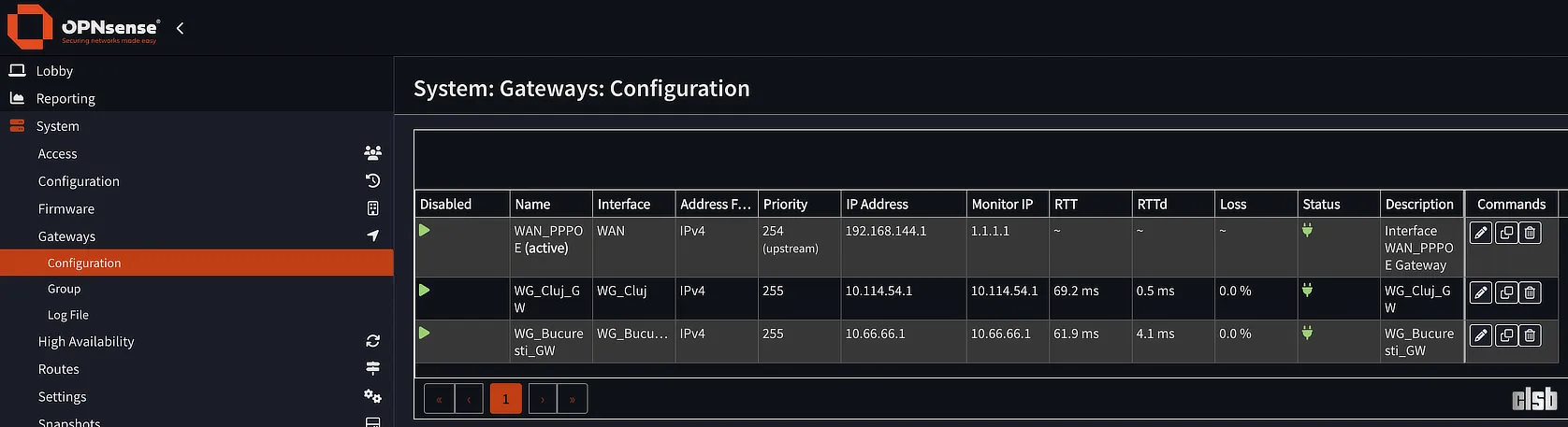 Vom adăuga două noi conexiuni WireGuard (client) către două locații externe (București și Cluj). Vom instrui OPNsense să detecteze automat traficul destinat Cloudflare sau Digi (folosind ASN-uri, nu liste manuale de IP-uri care se schimbă constant) și să îl ruteze prin VPN. Dacă tunelul principal (Cluj) pică, traficul va trece automat pe cel secundar (București).