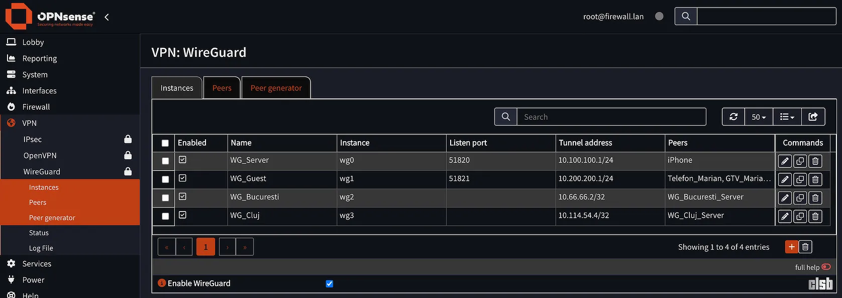 Presupunem că aveți deja serverele WireGuard configurate în locațiile remote. În OPNsense-ul local, procesul este următorul: