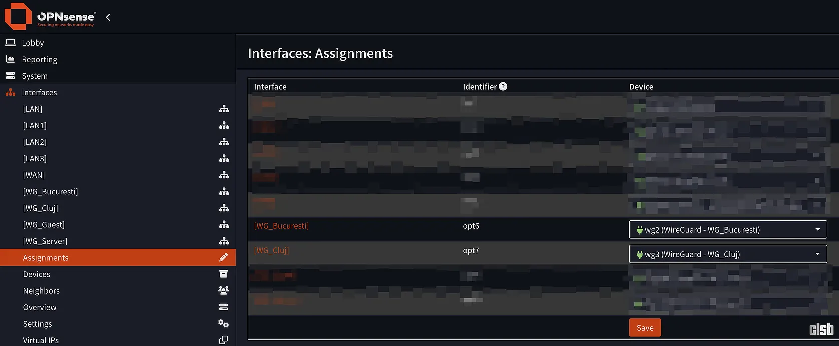 - Mergeți la Interfaces » Assignments. Asignați instanțele WireGuard create (ex:
