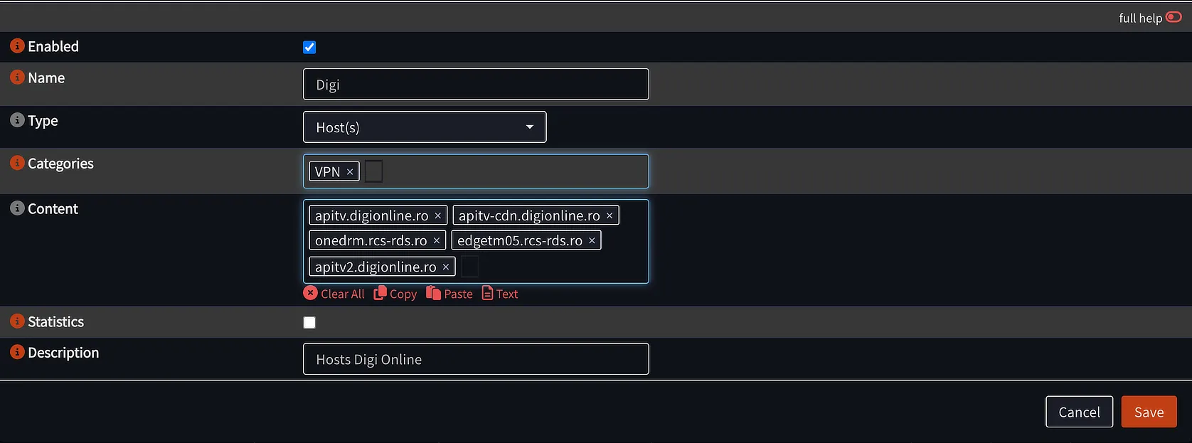 Safety Net: Creați încă un alias de tip Host(s) numit VPN_Endpoint_Digi care să conțină adresele DDNS ale serverelor VPN (ex: dnsulmeu.go.ro). Vom avea nevoie de el pentru a preveni buclele de rutare (au am mai creat două și pentru acces la rețelele înc are se află serverele WirewGuard, câte una pentru fiecare, utilizate în reguli LAN separate).
