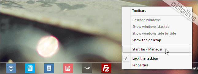 În astfel de cazuri, soluția e mult mai simplă și la îndemâna oricui decât mulți și-ar fi imaginat: Task Manager. Dacă doriți să închideți concomitent toate programele ce rulează în sistem, faceți click dreapta pe Bara de Activități (Taskbar) și alegeți din listă opțiunea Start Task Manager.