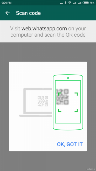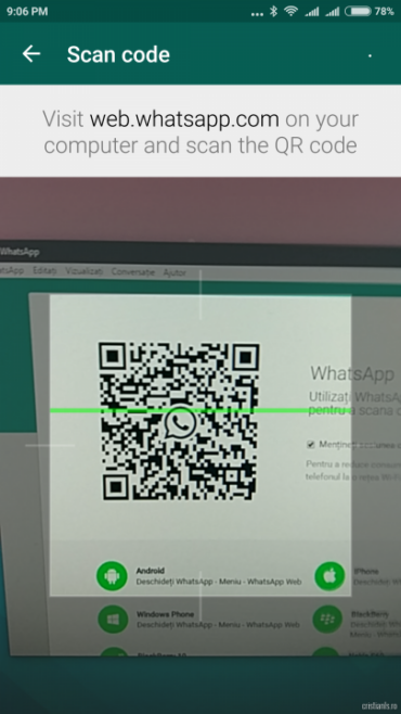 După descărcarea și instalarea clientului, conectați telefonul la aceeași conexiune (la același router), dezactivați datele mobile, deschideți aplicația în telefon și apăsați accesați meniul în fereastra de conversații. Apăsați pe WhatsApp Web și scanați codul afișat în clientul instalat în calculator, în fereastra principală a acestuia.