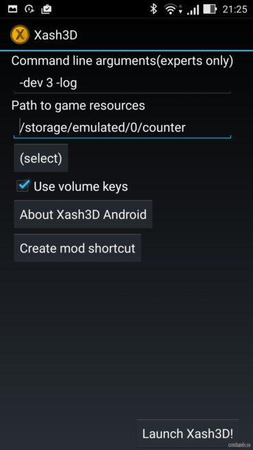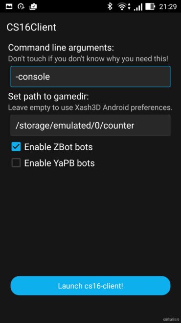 Se deschide în smartphone aplicația Xash3D și i se indică acesteia folderul ce conține cele două foldere copiate din calculator, apoi se face același lucru și cu clientul CS16.