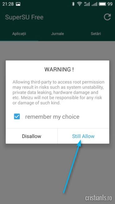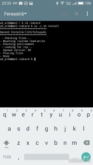 Când telefonul a repornit, deschideți acordați SuperSU acces ROOT, deschideți Terminal Emulator și executați în acesta, pe rând, comenzile de mai jos :