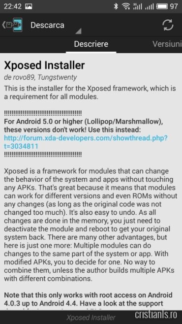 Urmând pașii descriși în continuare veți instala versiunea 80 a Xposed Framework, dar ideal ar fi să descărcați cea mai recentă versiune disponibilă în momentul efectuării instalării, altfel nu veți beneficia de noutățile și îmbunătățirile aduse acestuia între timp.