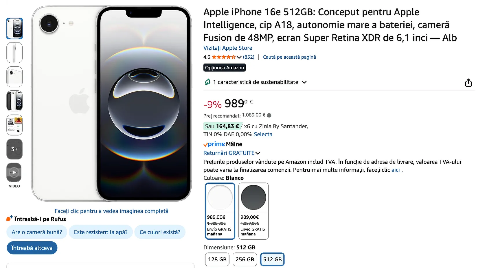 După o scurtă vizită pe Amazon, entuziasmul inițial s-a cam evaporat când am văzut că versiunea de 512GB a lui iPhone 16e costă nu mai puțin de 1000 de euro.