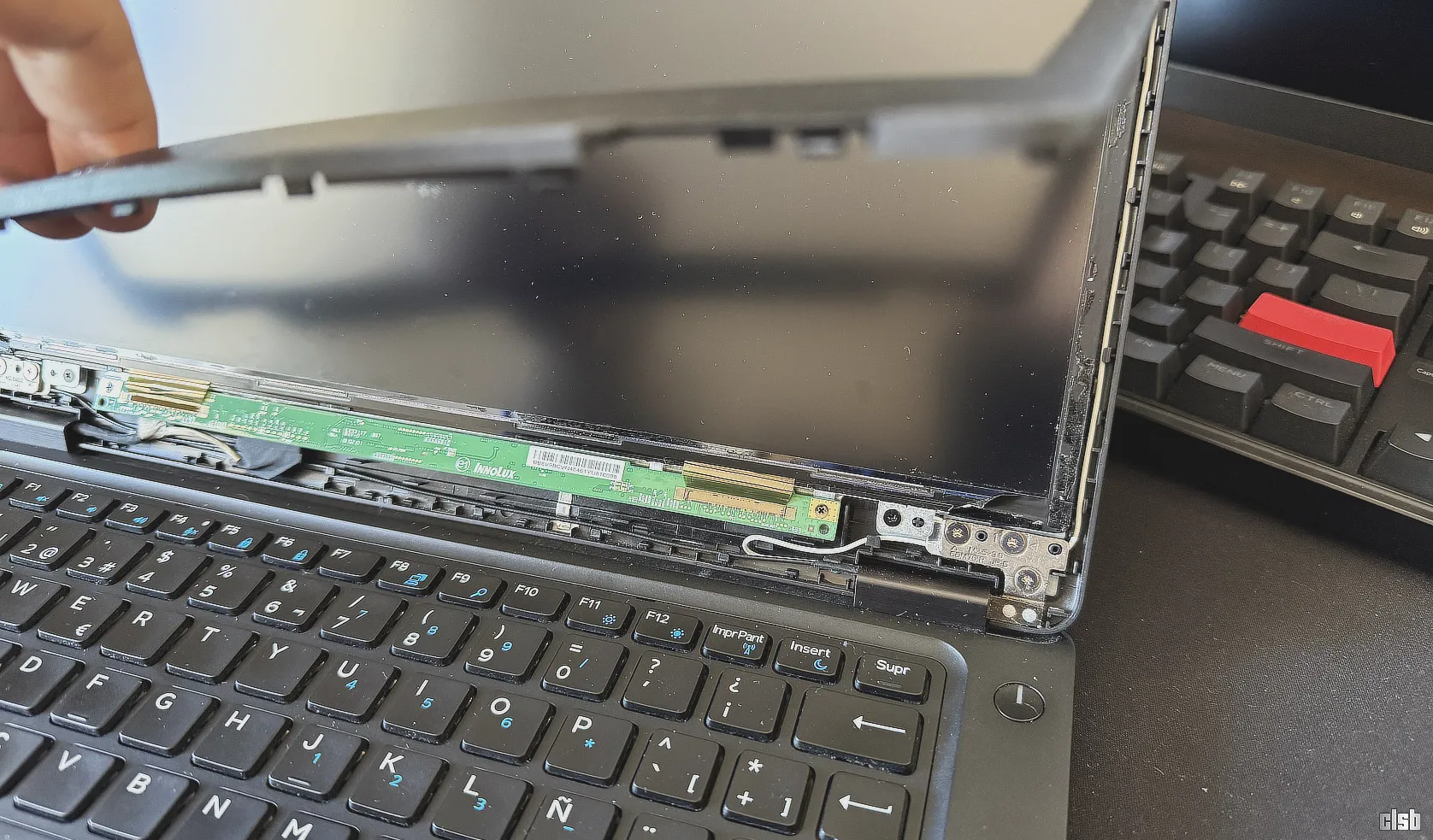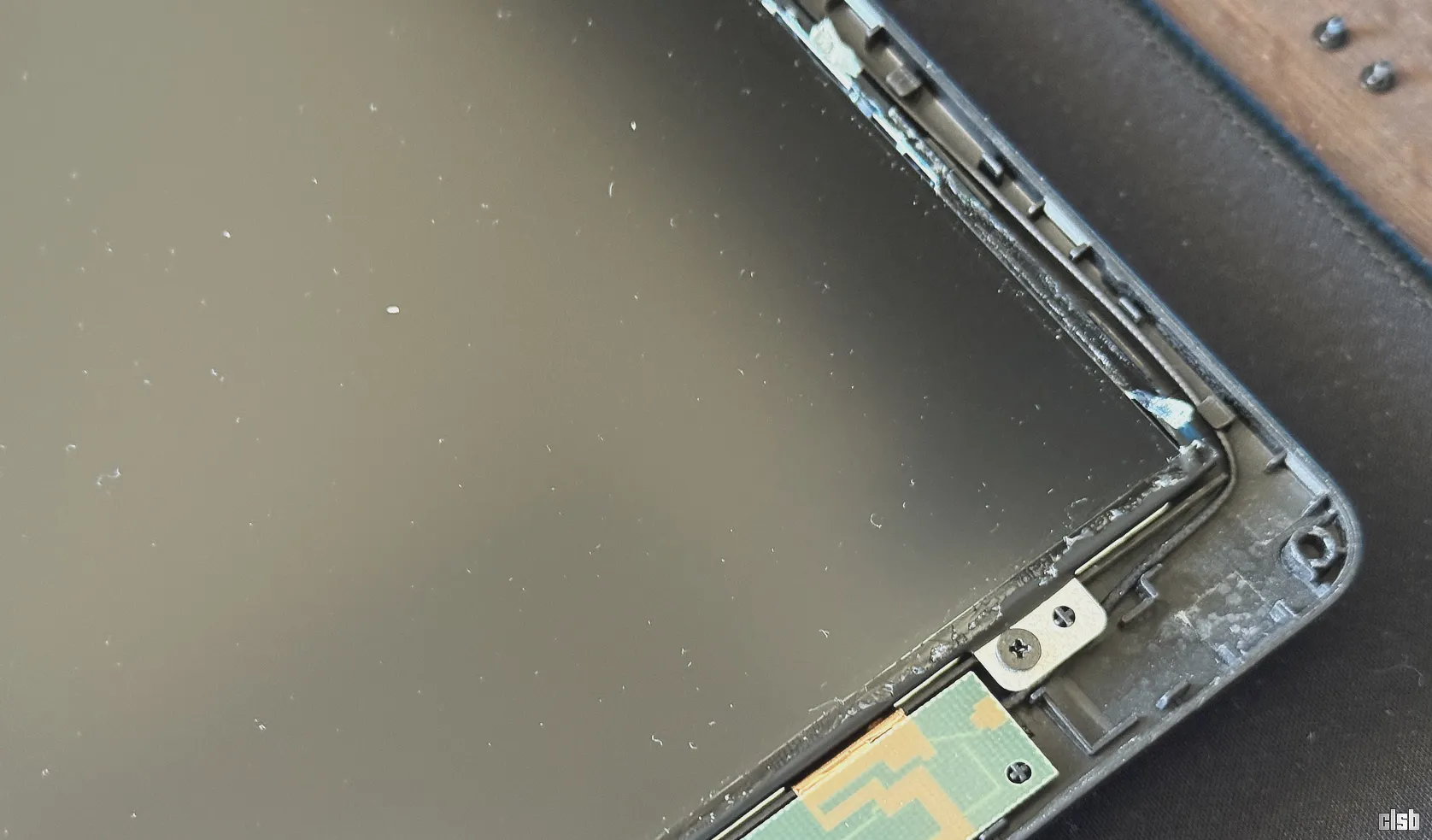 După ce i-am montat un SSD, am instalat un sistem de operare și am confirmat că totul este funcțional, am decis să desfac rama pentru a investiga cauza acelei separări evidente. Ceea ce am găsit a fost definiția unei lucrări de mântuială: adezivul original era acoperit de praf și nu mai lipea absolut nimic, fixarea fiind lăsată în seama clemelor din plastic.