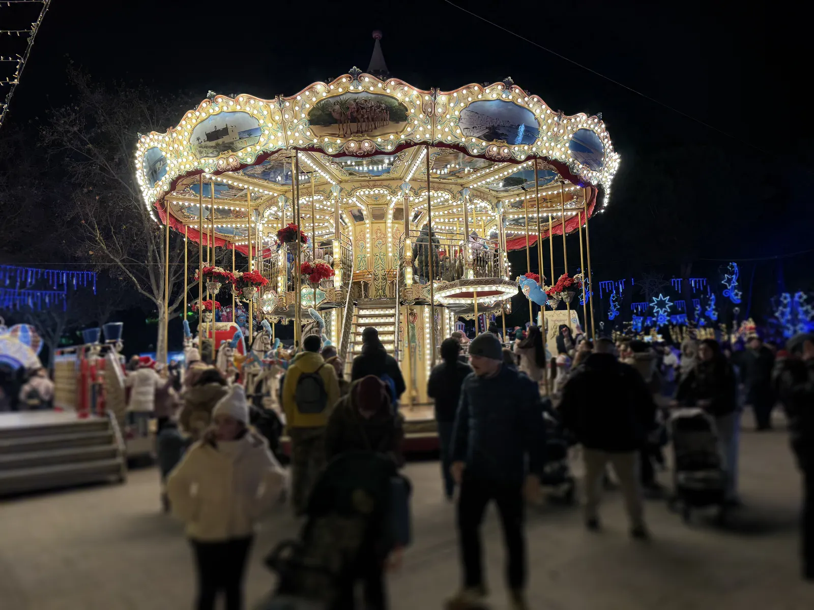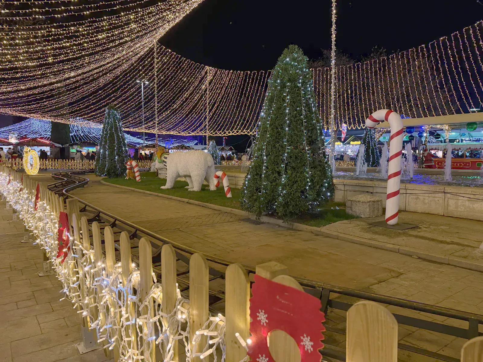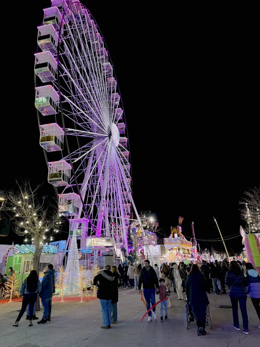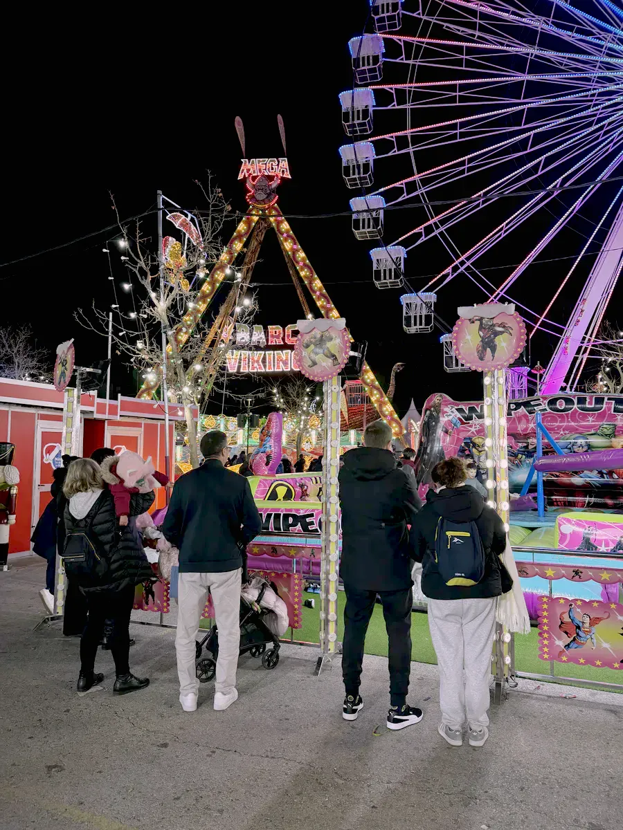 Atracțiile sunt variate și acoperă o plajă largă de vârste, de la clasicele carusele care îi fascinează pe cei mici până la roata panoramică (Noria) pentru o vedere de ansamblu asupra întregului parc. Am observat că trenulețul roșu de Crăciun, decorat cu reni, este una dintre piesele de rezistență, fiind asaltat constant de vizitatori dornici de fotografii, la fel și trambulinele. Totul este luminat spectaculos, creând acea atmosferă caldă, în ciuda temperaturilor scăzute de afară.