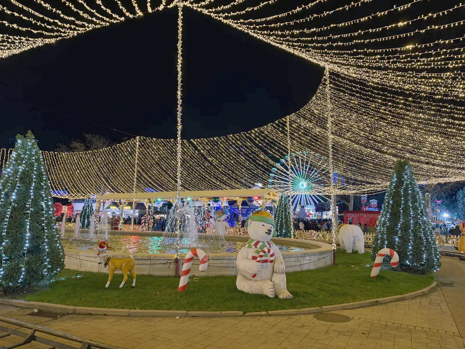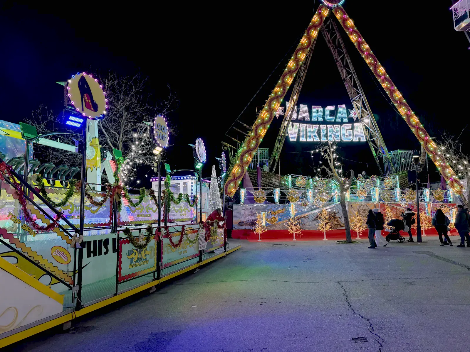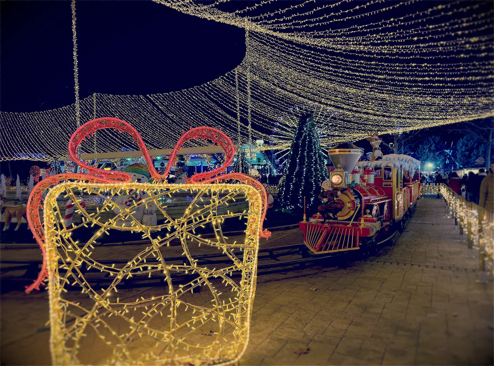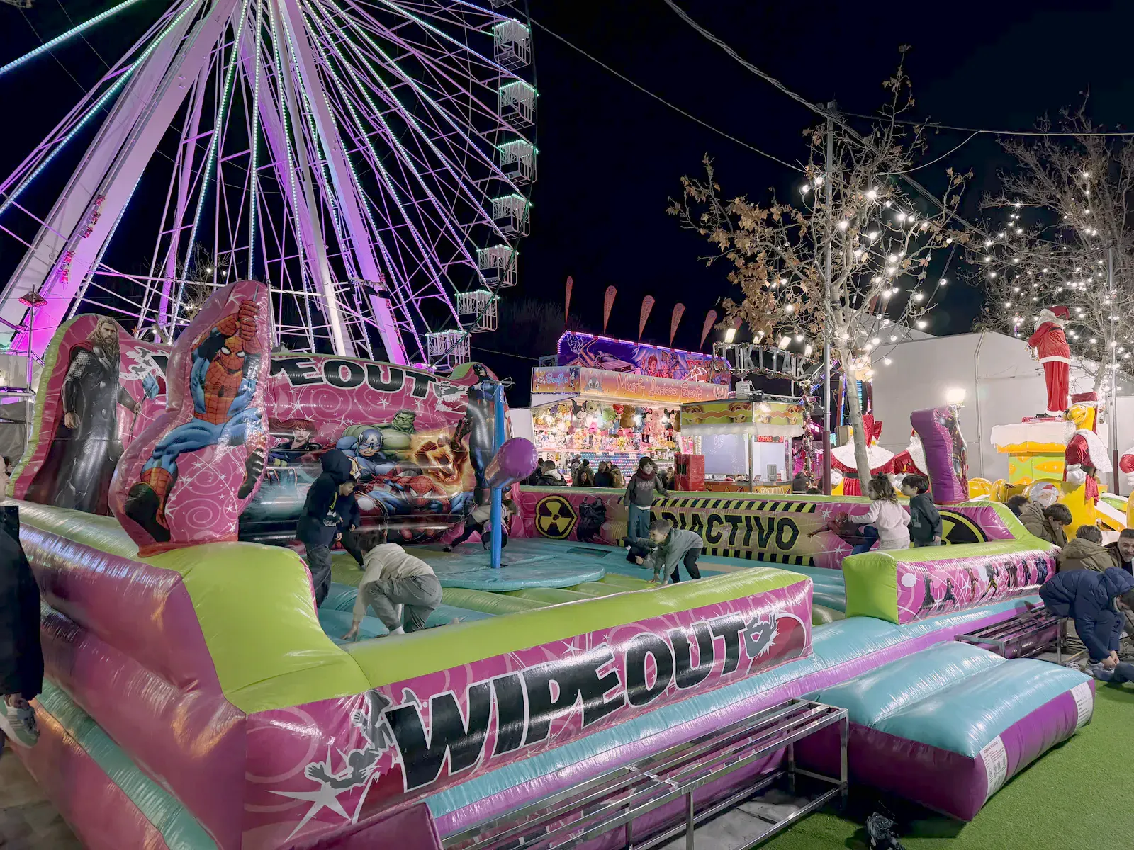 Atracțiile sunt variate și acoperă o plajă largă de vârste, de la clasicele carusele care îi fascinează pe cei mici până la roata panoramică (Noria) pentru o vedere de ansamblu asupra întregului parc. Am observat că trenulețul roșu de Crăciun, decorat cu reni, este una dintre piesele de rezistență, fiind asaltat constant de vizitatori dornici de fotografii, la fel și trambulinele. Totul este luminat spectaculos, creând acea atmosferă caldă, în ciuda temperaturilor scăzute de afară.