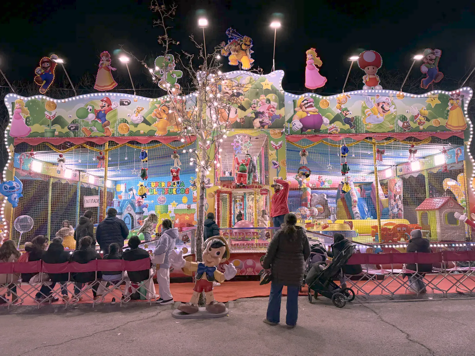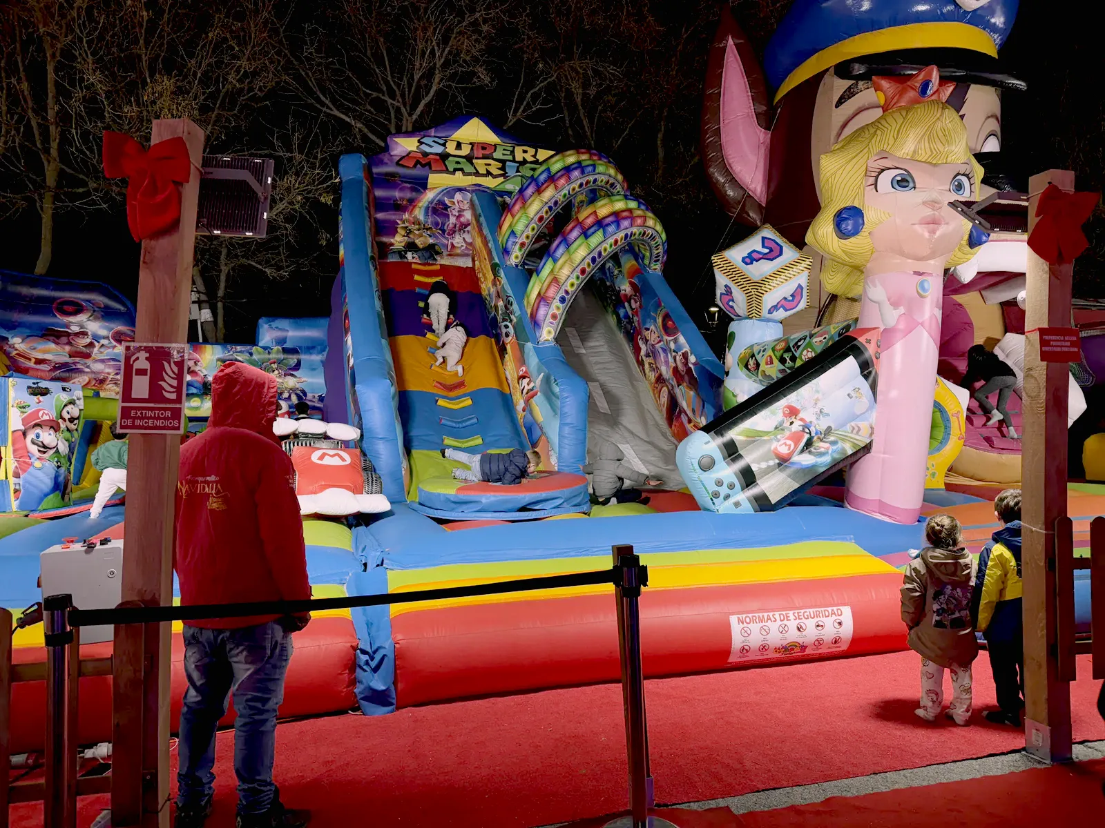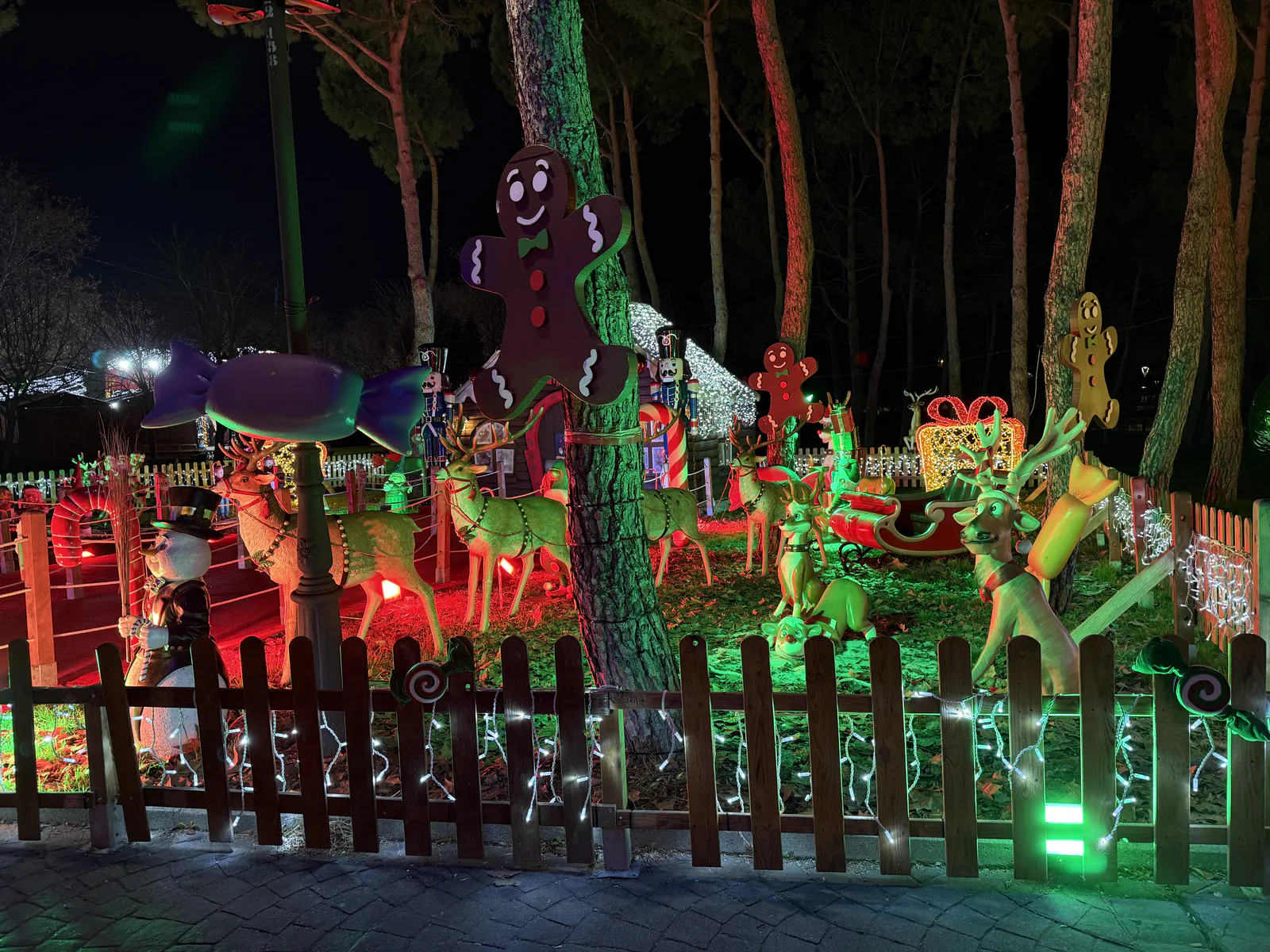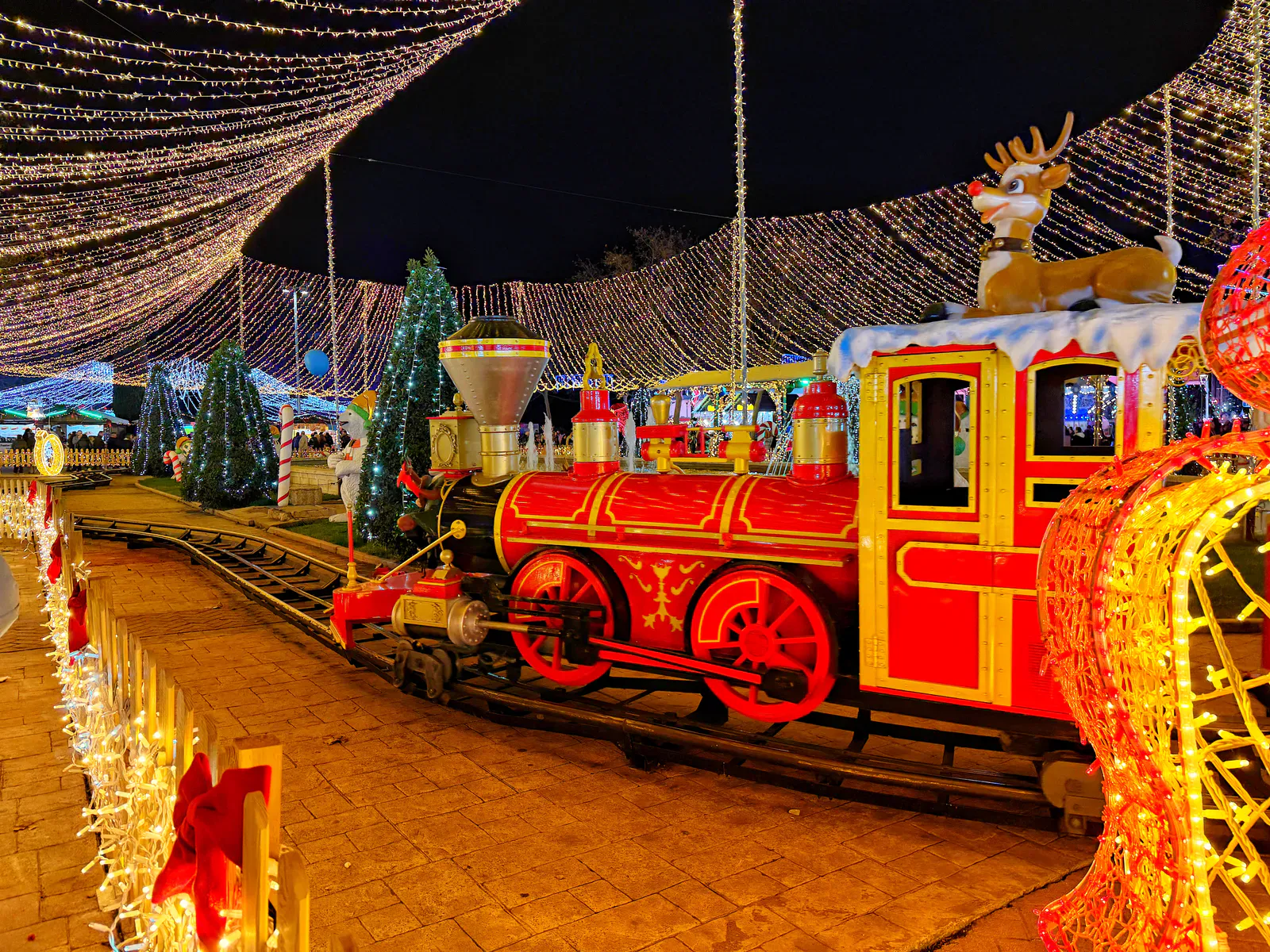 Atracțiile sunt variate și acoperă o plajă largă de vârste, de la clasicele carusele care îi fascinează pe cei mici până la roata panoramică (Noria) pentru o vedere de ansamblu asupra întregului parc. Am observat că trenulețul roșu de Crăciun, decorat cu reni, este una dintre piesele de rezistență, fiind asaltat constant de vizitatori dornici de fotografii, la fel și trambulinele. Totul este luminat spectaculos, creând acea atmosferă caldă, în ciuda temperaturilor scăzute de afară.