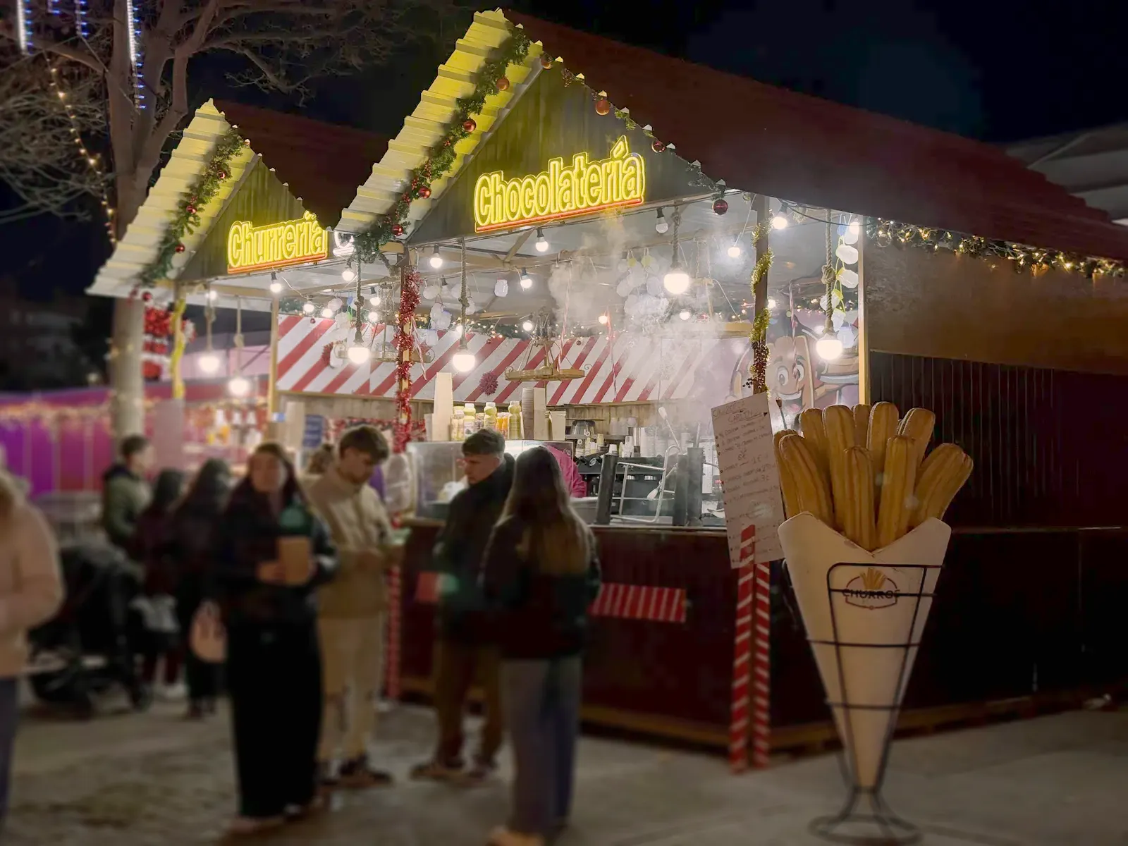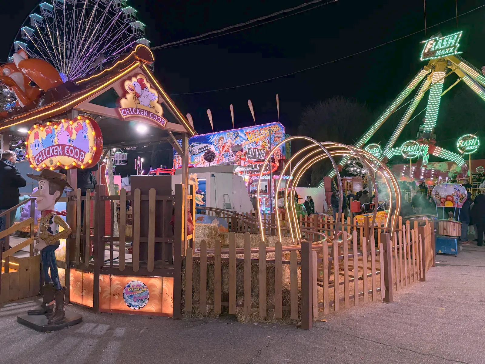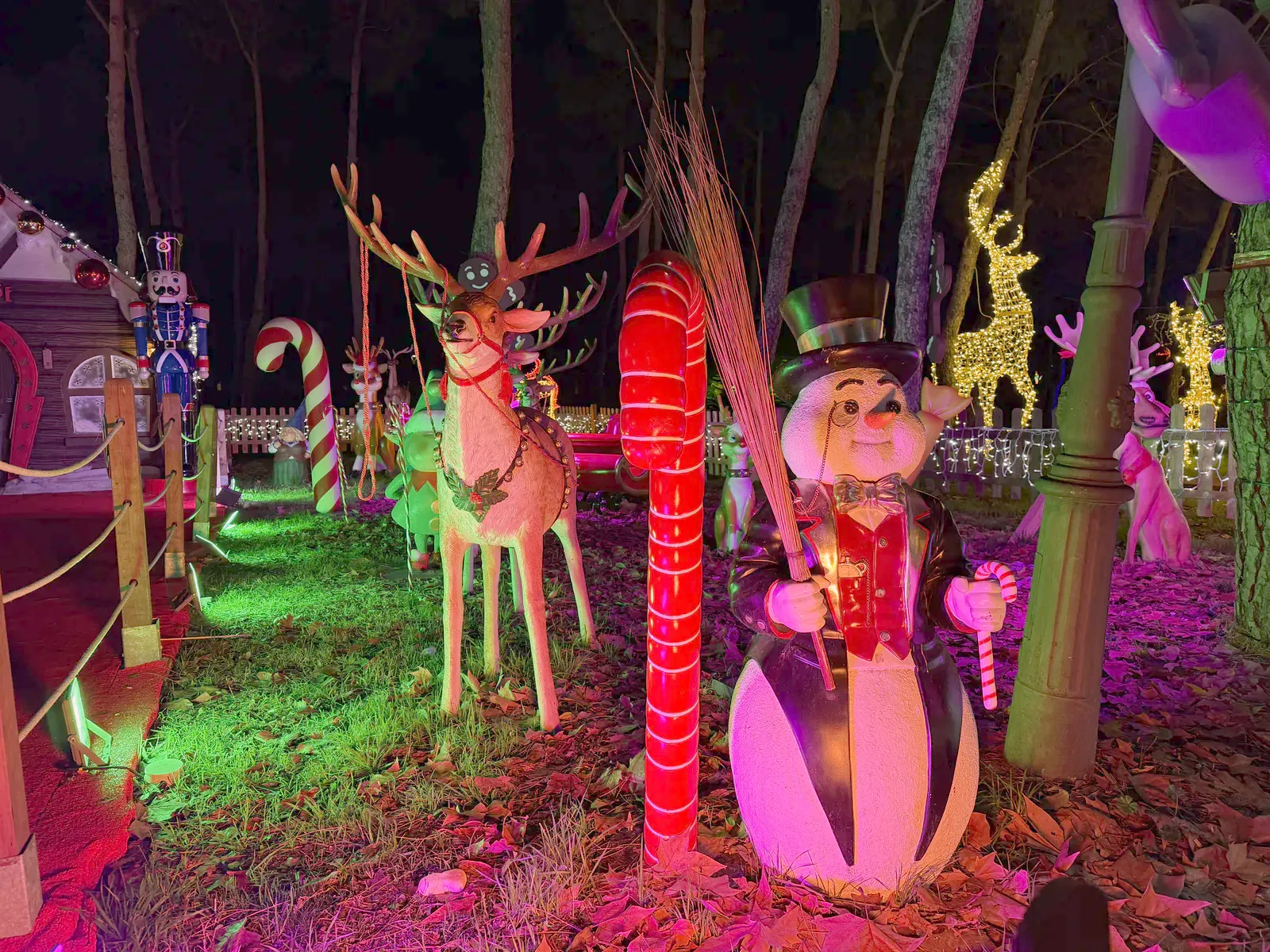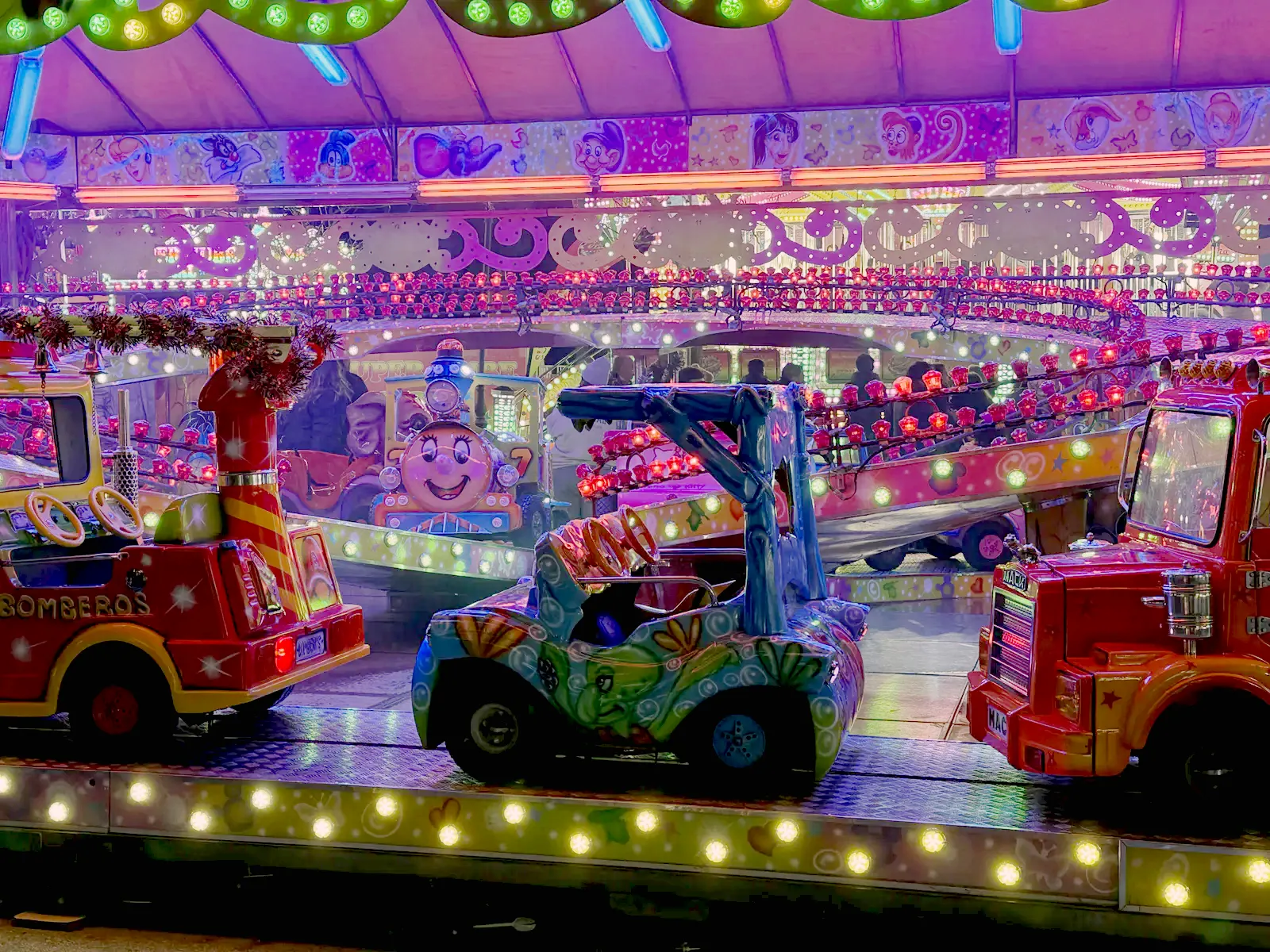 Atracțiile sunt variate și acoperă o plajă largă de vârste, de la clasicele carusele care îi fascinează pe cei mici până la roata panoramică (Noria) pentru o vedere de ansamblu asupra întregului parc. Am observat că trenulețul roșu de Crăciun, decorat cu reni, este una dintre piesele de rezistență, fiind asaltat constant de vizitatori dornici de fotografii, la fel și trambulinele. Totul este luminat spectaculos, creând acea atmosferă caldă, în ciuda temperaturilor scăzute de afară.