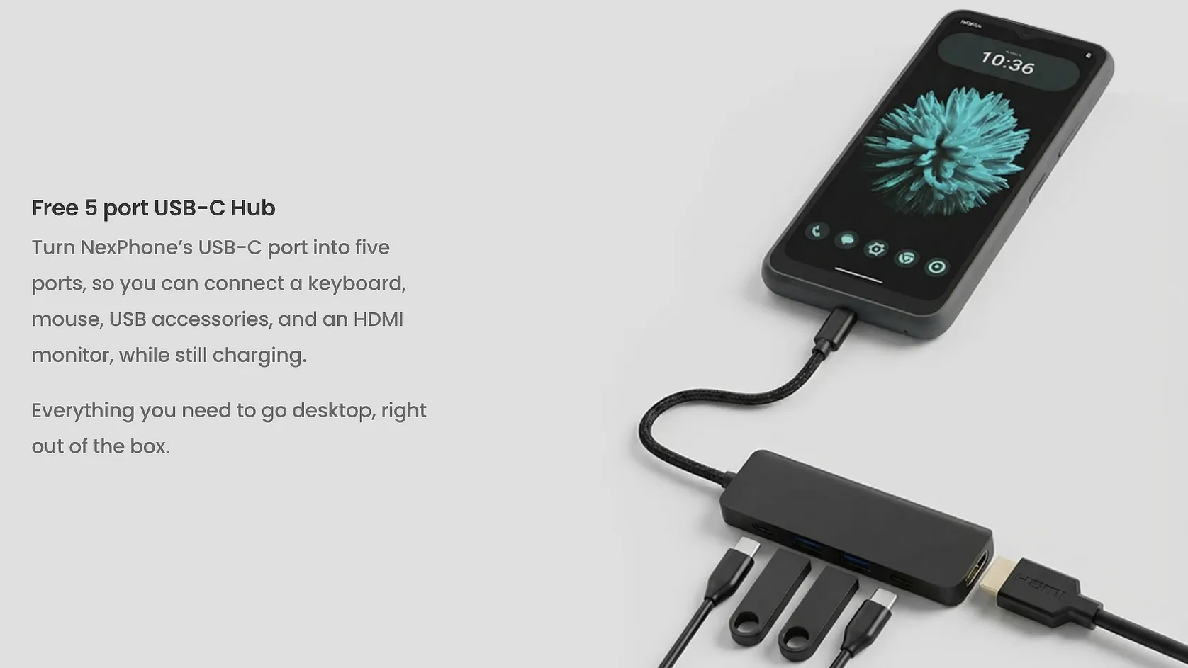 NexPhone este disponibil pentru precomandă la un preț final de 549 de dolari. Pentru obținerea unui dispozitiv din primele loturi este necesar un depozit rambursabil de 199 de dolari, restul sumei urmând a fi achitată înainte de livrare, estimată pentru trimestrul al treilea din 2026. În pachet este inclus gratuit și un hub USB-C, esențial pentru a transforma rapid telefonul într-o stație de lucru completă cu monitor HDMI și periferice.