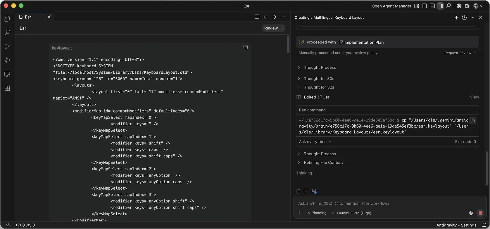 Am integrat layout-ul spaniol (pentru accente și simboluri specifice, respectând comportamentul nativ ca pe PC-ul de serviciu) și layout-ul „Romanian Programmers” (pentru diacritice) direct în layout-ul nativ S.U.A. al tastaturii fizice pe care o folosesc. Asta îmi simplifică enorm trecerea de la Windows (serviciu) la Linux ori Mac (acasă). Deși nu era absolut necesar și aș fi putut lucra la fișierul .keylayout în orice alt folder, i-am dat IDE-ului Antigravity acces la fișierul de sistem pentru a vedea exact cum procedează agentul pentru a ajunge la el, a-l edita și a aplica modificările.