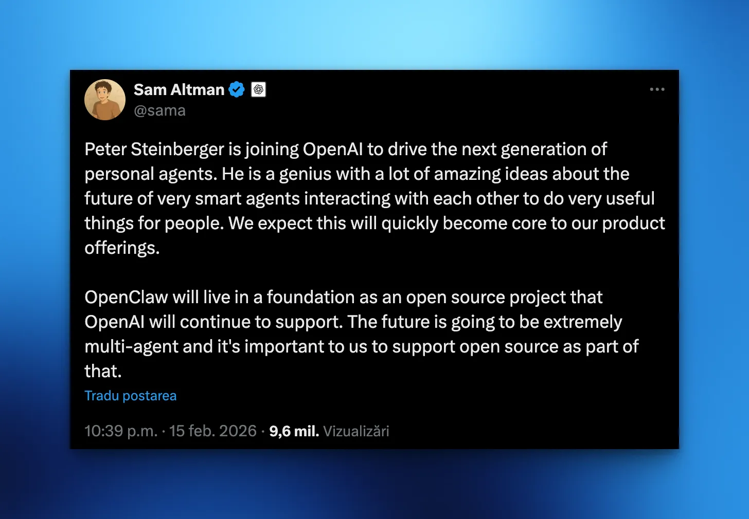 Nu sunt deschis la OpenClaw în noua formulă tocmai fiindcă, deși proiectul rămâne open-source sub umbrela unei fundații, viitorul său pare acum incert fără motorul principal din spate.
