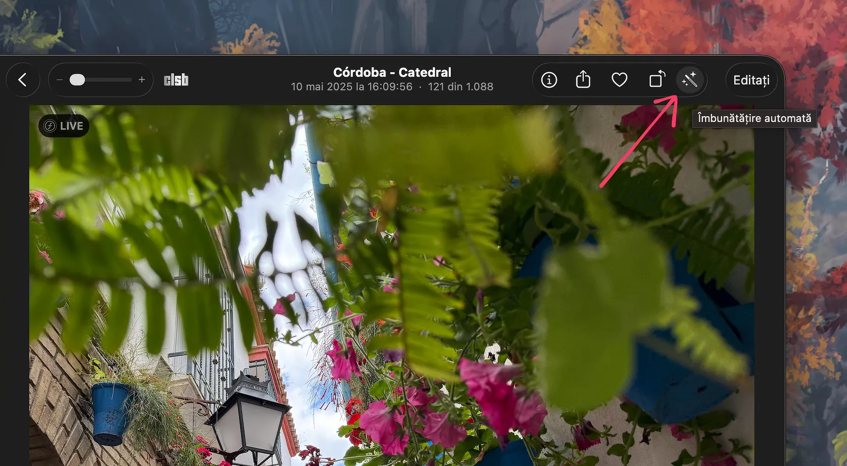 A doua chestie utilă e optimizarea rapidă: apăs un buton și poza e ajustată automat. Pentru multe poze făcute cu telefonul (în cazul meu, cu iPhone 16 Pro), deja la o calitate bună din start, e suficient cât să o public pe rețele sau pe blog fără să pierd timp cu reglaje fine. Nu e editare „artistică”, e un shortcut pragmatic care, în practică, scurtează drumul de la poză la postare. Fix genul de funcție care te face să folosești aplicația fără să-ți dai seama.