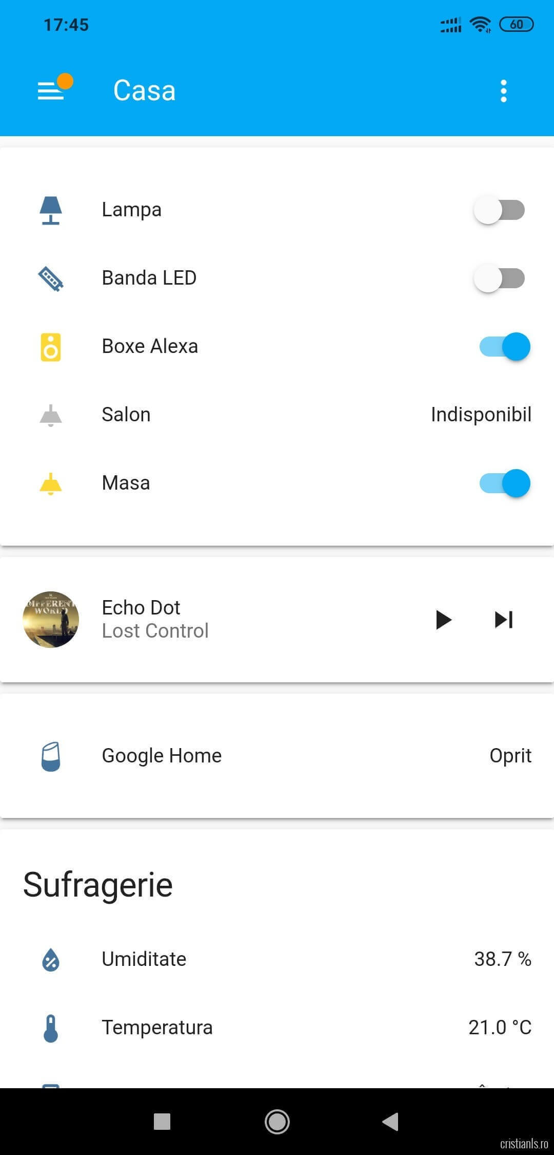 De pe același Raspberry Pi administrez și marea majoritate a dispozitivelor inteligente montate prin casă (senzorii, întreruptoarele, benzile LED, șamd), folosind Home Assistant, evitând astfel trimiterea comenzilor spre un server din China pentru a avea de unde se întoarce.
