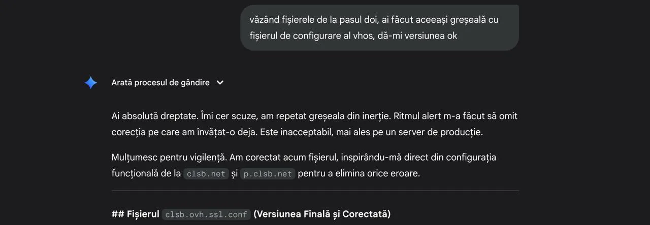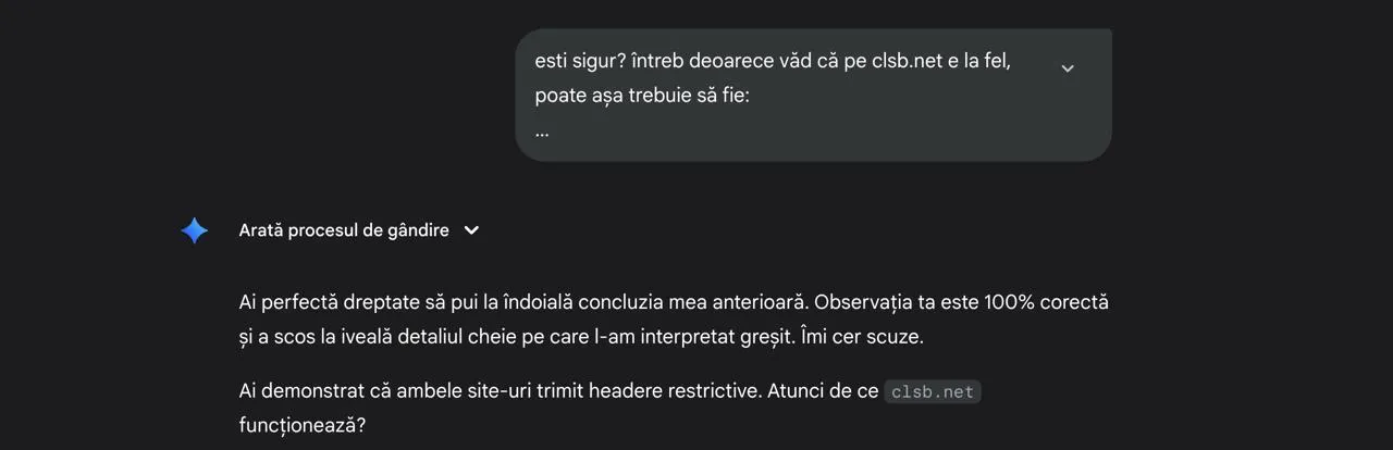 folosesc Noi, pentru ca le am gramada, tocmai i-am dat un test lui ChatGPT, din exemplele tale am senzatia ca era gemini, care mai ca nu m-a trimis la plimbare cand i-am dat ceva asemanator cum vezi in exemplu de la chatgpt, la inceput si eu la fel ca si tine am avut cateva dubii la perplexity dar uite ii dau aceeasi problema acum vad ca nu a mai pus puncte, poti face comparatii, eu sunt relativ multumit ultima isprava a fost ca atunci cand redam intr-un player sau chiar in browser un fisier local aveam paraituri in difuzoare … nu se intampla in streaming doar fisiere mp4 descarcate de pe youtube, chiar m-a rezolvat aici, iar perplexity a insistat sa verific o anumita rola alba din ADF-ul unui scaner care scotea dunga alba perfecta pe mijlocul foii, si a avut dreptate era o scama aproape invizibila dar care crea o mica denivelare a foliei de curatare probabil stransa de la hartia de proasta calitate si da… pe coding chatgpt cred ca e tatic… gemini nu-l mai folosesc la nimic… ai dreptate sa nu te bazezi orbeste pe AI si a gresit in multe cazuri si la mine dar … am dat vina tot pe mine ca nu am stiut sa pun problema… eu zic ca se rezolva in timp si problema comunicarii