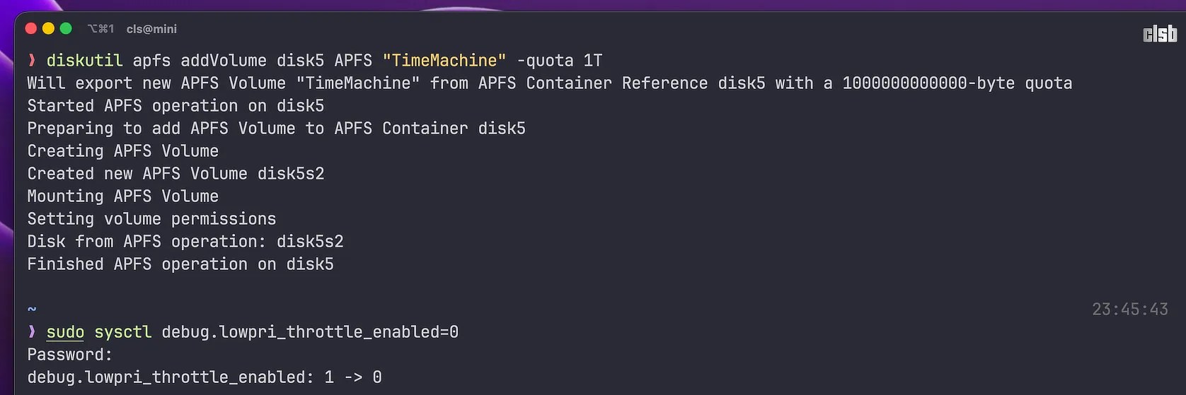 # Șterge discul și creează containerul principal DATA diskutil eraseDisk APFS "DATA" gpt /dev/diskX # Adaugă un volum pentru TimeMachine cu limită de 1TB în același container diskutil apfs addVolume diskY APFS "TimeMachine" -quota 1T