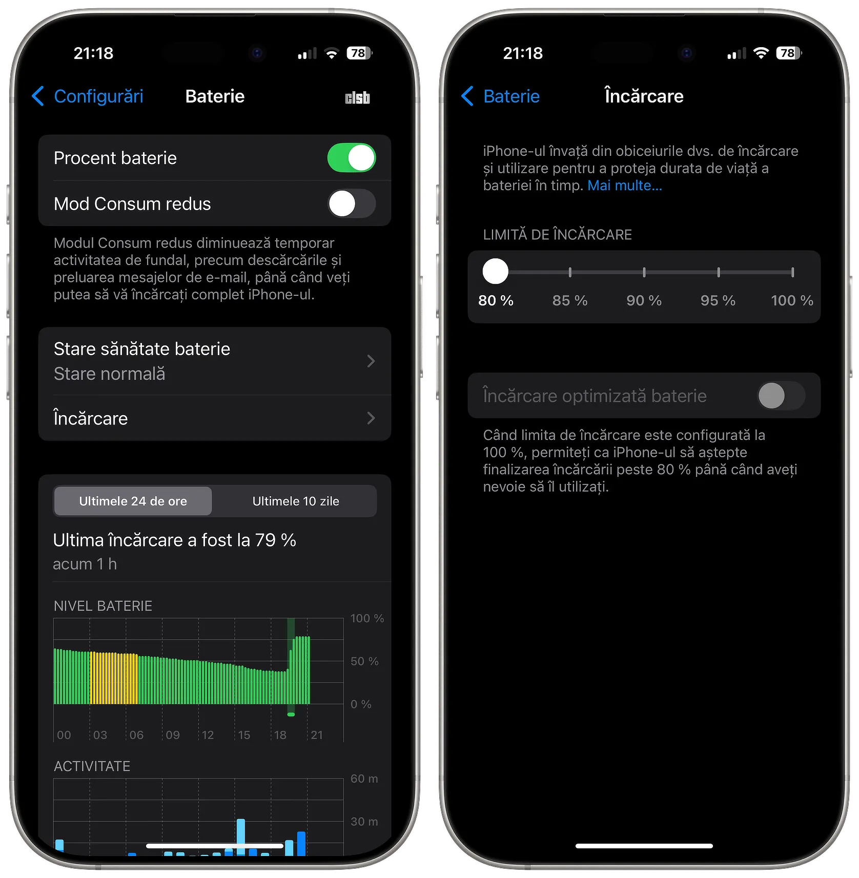 Ce îmi place foarte mult la implementarea celor de la Apple este că, deși limita e setată la 80%, sistemul „știe” să o ignore ocazional. Din când în când, iOS permite încărcarea până la 100% pentru a menține estimările bateriei precise. E o funcție „set and forget” excelentă, mult mai comodă decât pe laptop, unde folosesc o limitare similară, dar trebuie să-mi amintesc singur să dezactivez protecția cam o dată pe lună pentru o calibrare completă.