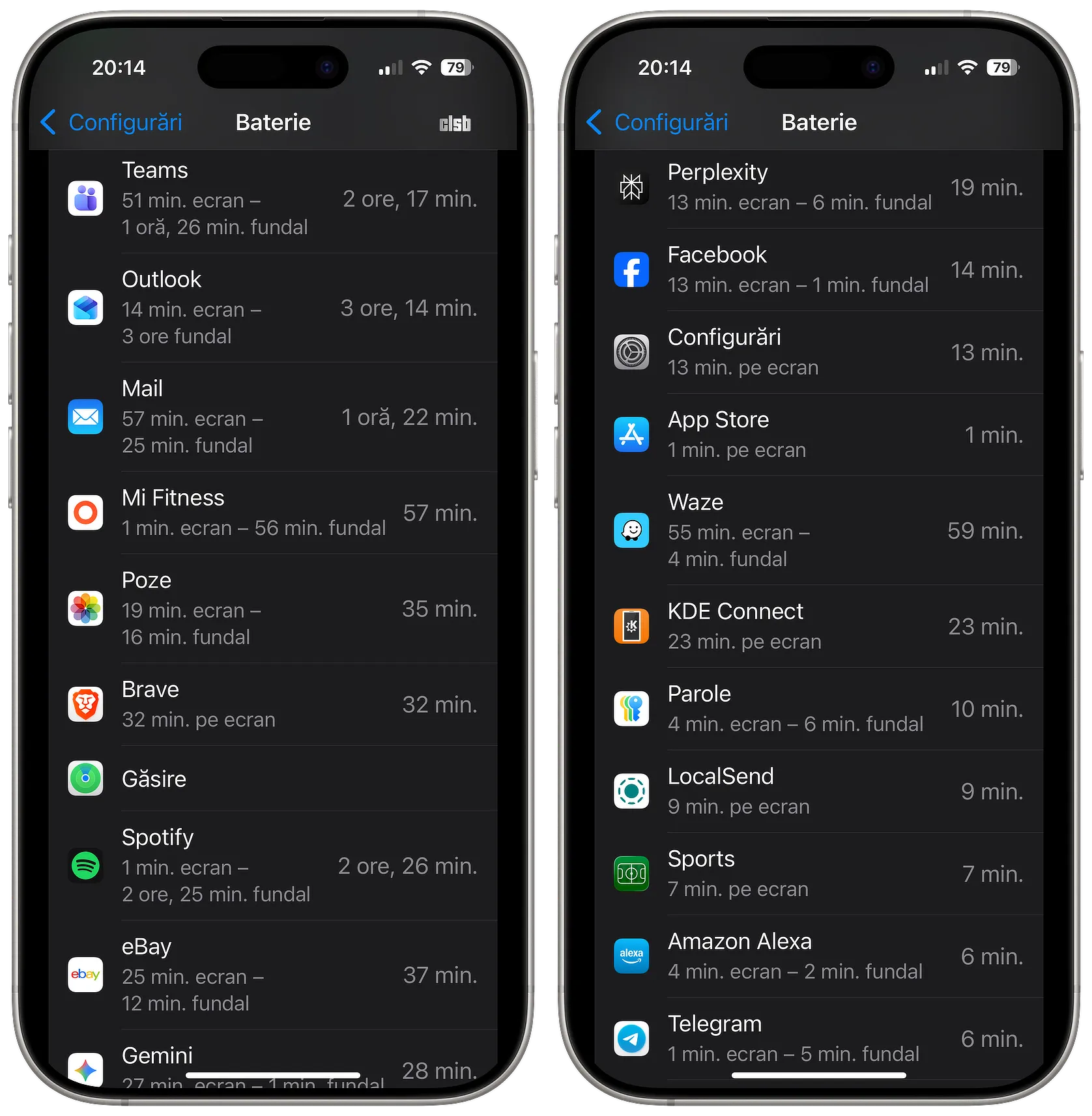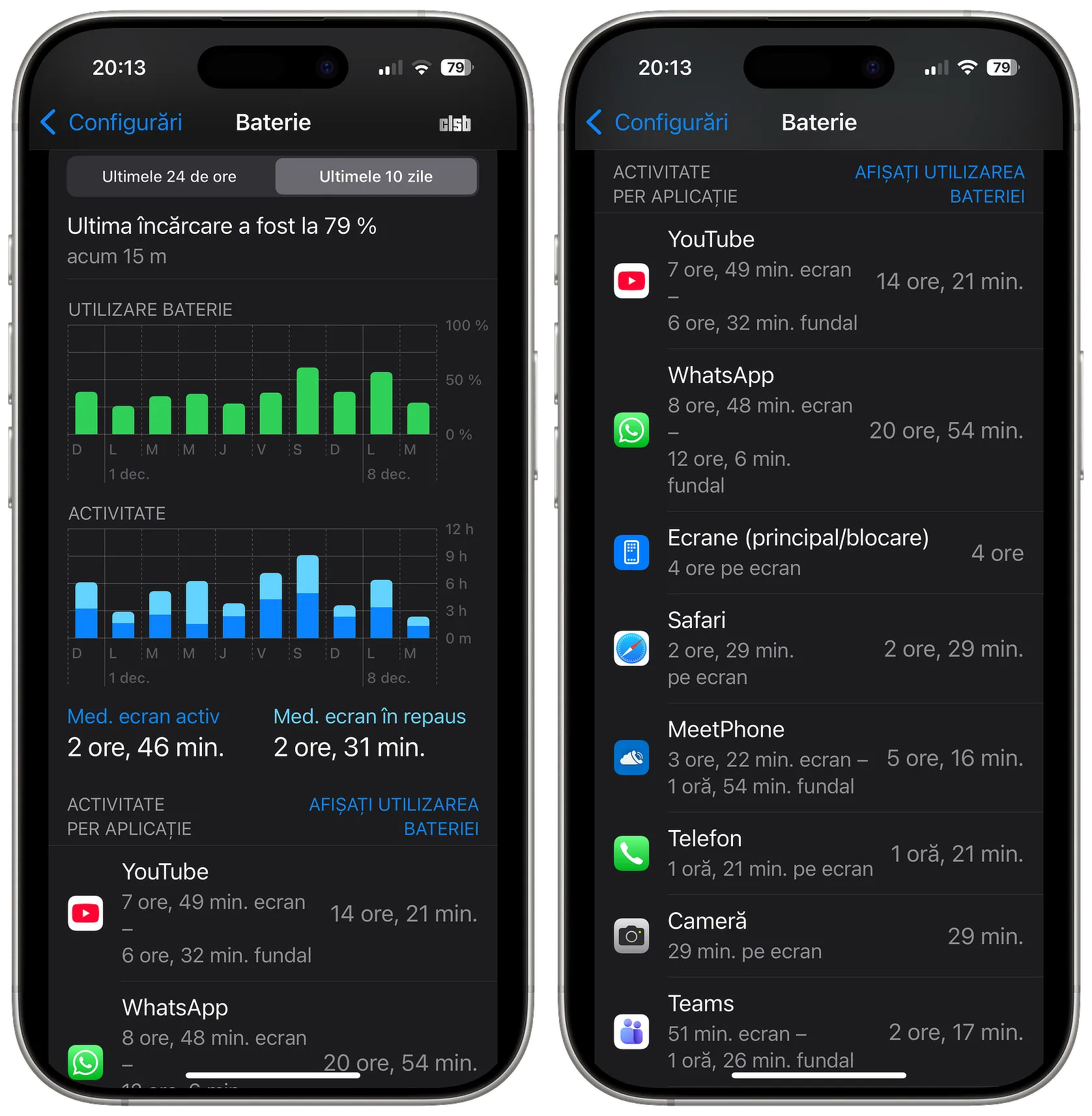 În schimb, telefonul este o mașinărie de redat media: YouTube domină detașat topul, fiind sursa mea principală pentru podcasturi video, urmat de Spotify pentru muzică. Cu o medie de ecran activ de aproape 3 ore pe zi și multă activitate în fundal (mai ales pe WhatsApp și aplicațiile de mail/Teams), telefonul este solicitat constant, dar într-un mod destul de predictibil.
