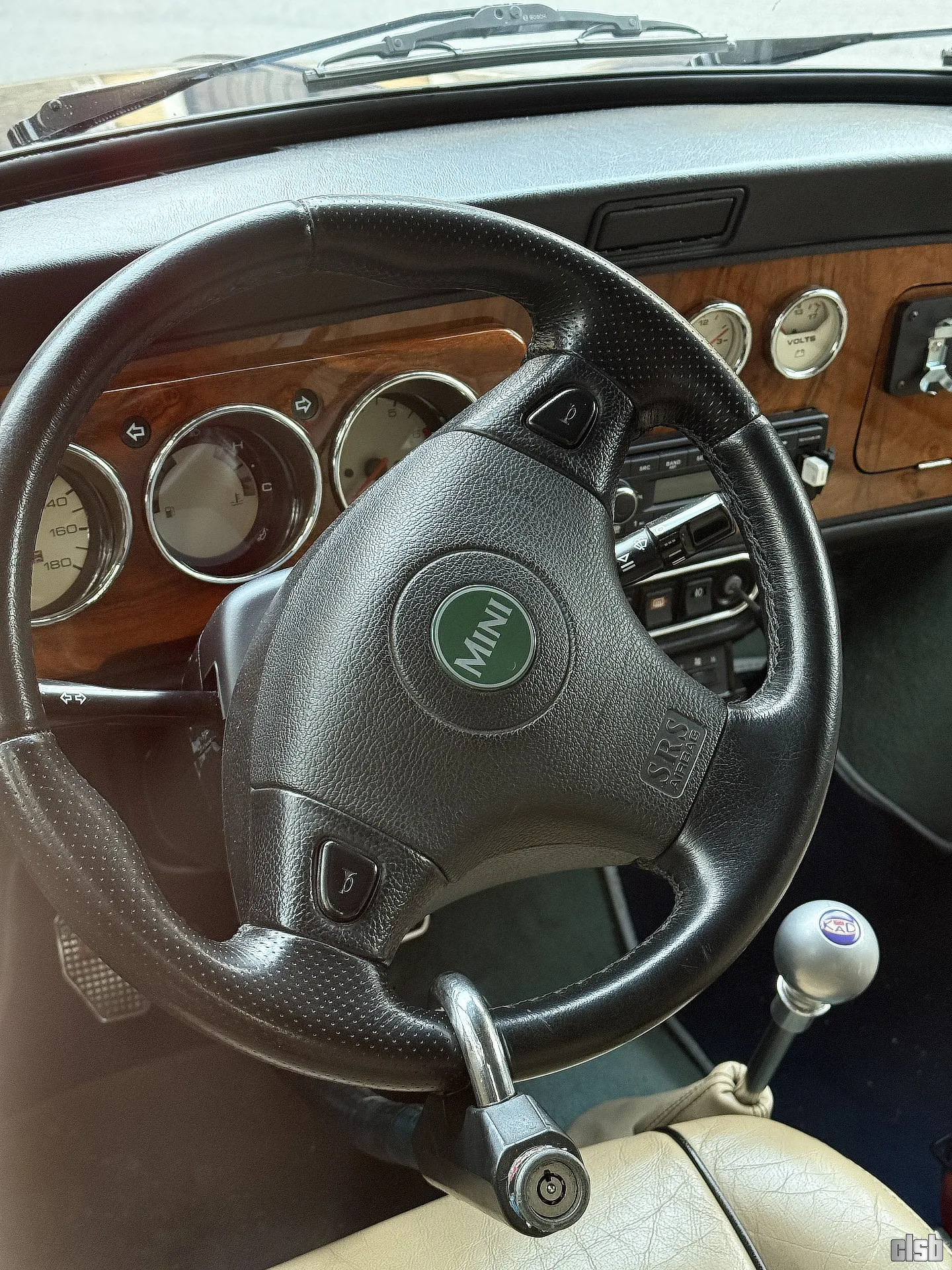 Interiorul este fix ce te-ai aștepta de la un Cooper de lux din ultima perioadă a producției: mult lemn de nuc pe bord și o atmosferă care îmbină stilul vintage cu încercările de modernizare de la sfârșitul mileniului. Un detaliu interesant pentru pasionații de siguranță (sau curioși) este prezența airbag-ului în volan. Mi se pare fascinant cum au reușit să înghesuie un sistem SRS și tot restul componentelor moderne într-o cabină atât de mică fără să strice estetica clasică a bordului.