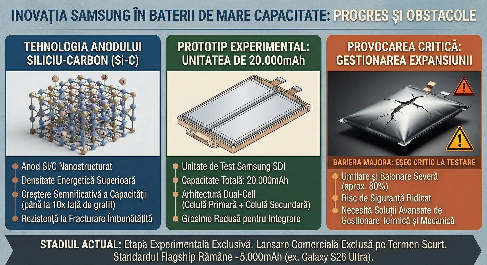 O astfel de dilatare ar fi catastrofală pentru un dispozitiv comercial, deoarece ar putea duce la explozia bateriei sau, în cel mai fericit caz, doar la distrugerea ecranului și a carcasei. Din acest motiv, tehnologia este încă în stadiu experimental și are nevoie de multă „șlefuire” înainte de a ajunge pe un flagship precum viitorul Galaxy S26 sau S27. Samsung trebuie să găsească o modalitate de a stabiliza amestecul de silicon și carbon pentru a preveni acest comportament instabil pe termen lung.