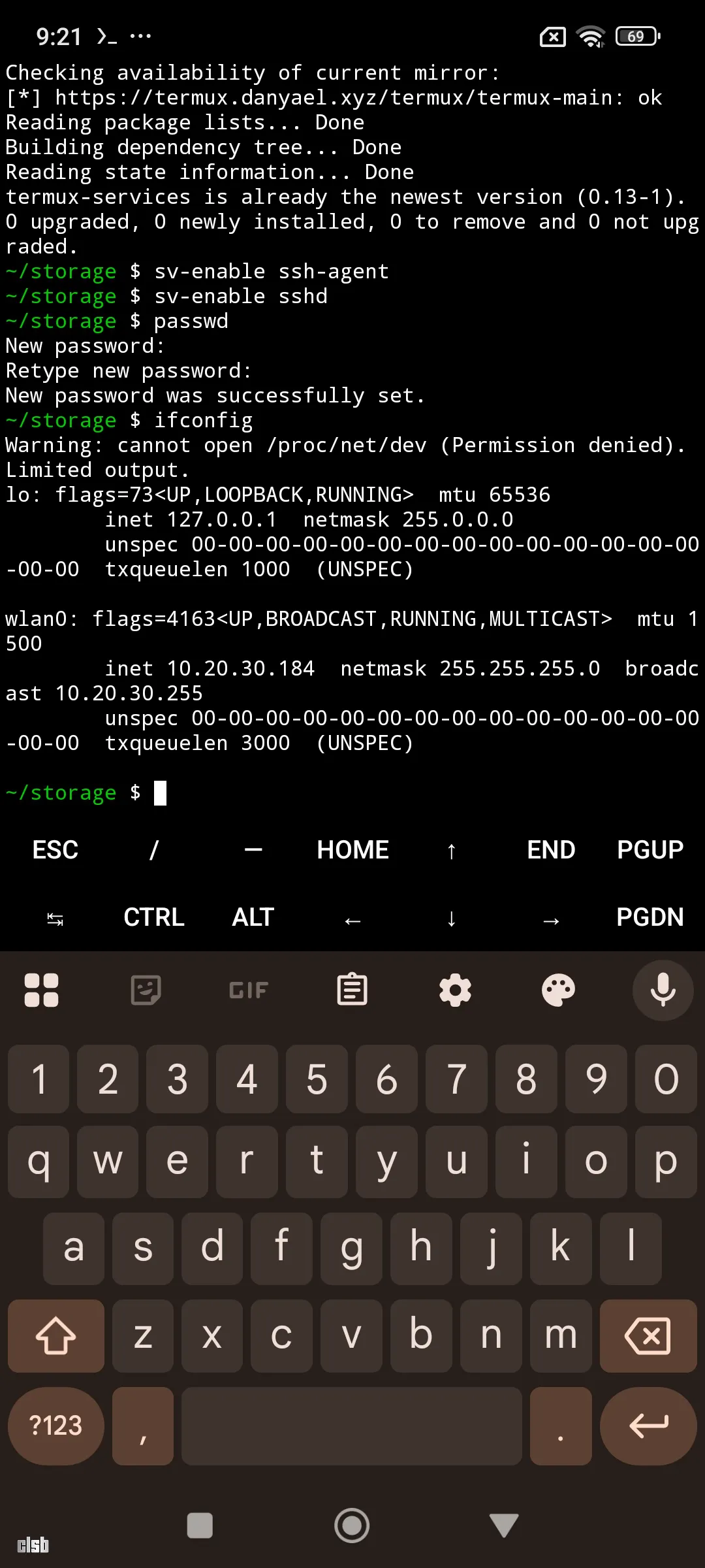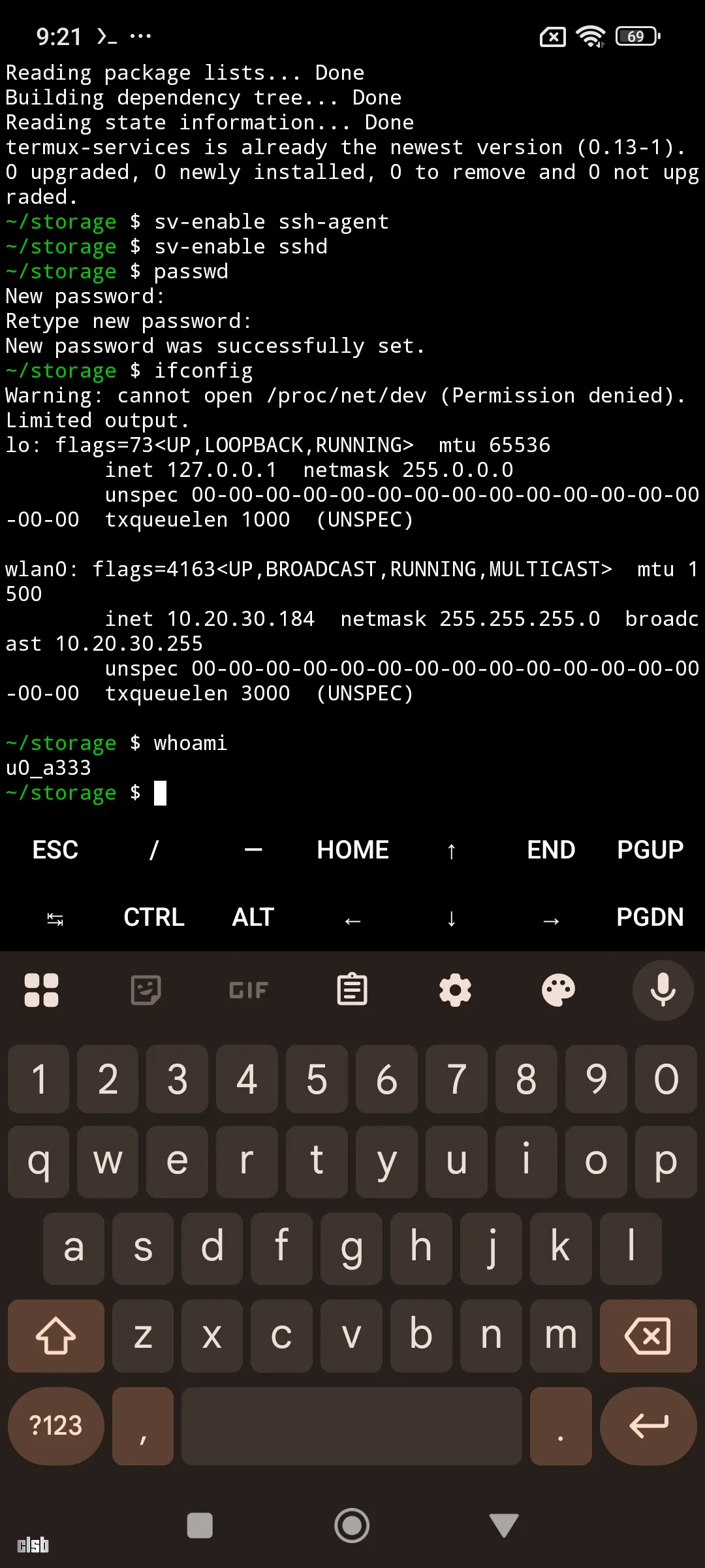 Cu serverul pornit și parola setată, mai trebuie doar să aflăm adresa IP a telefonului în rețeaua locală, folosind comanda ifconfig
